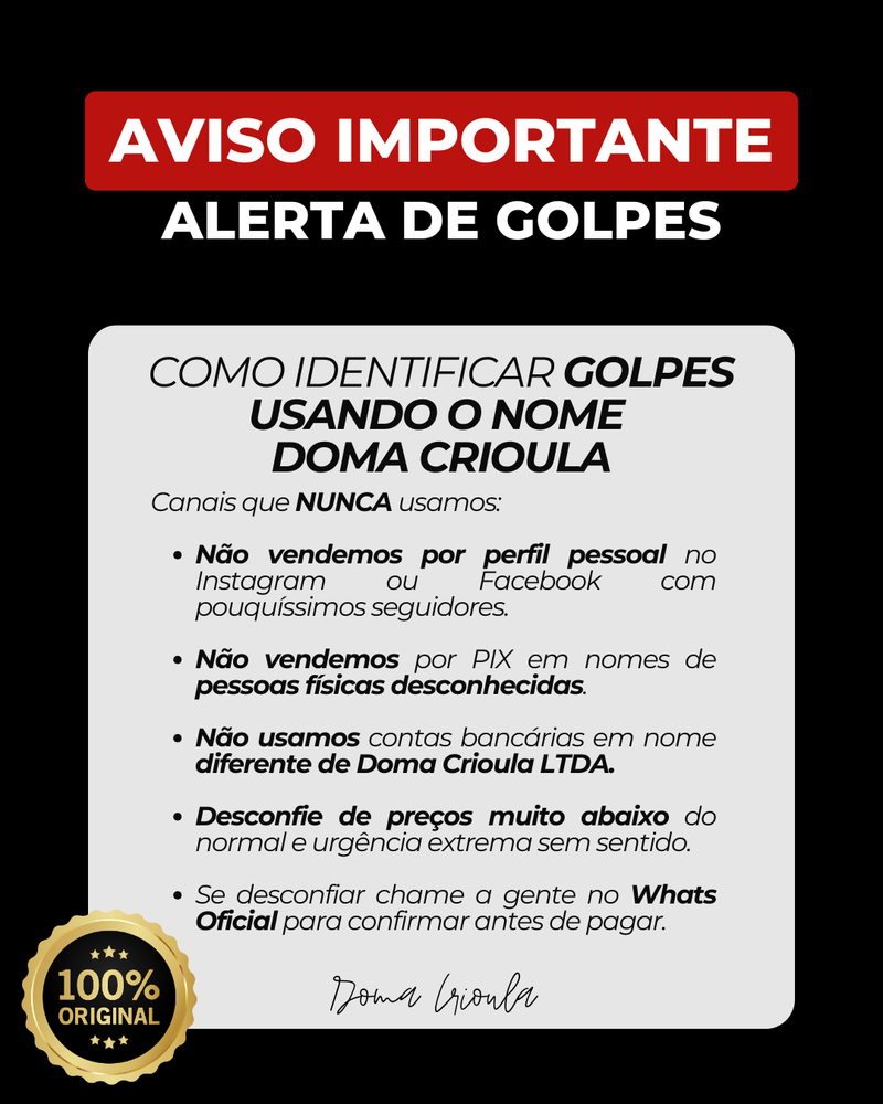 Infelizmente, algumas pessoas têm usado indevidamente o nome Doma Crioula para aplicar golpes, criando perfis falsos, sites não oficiais e oferecendo “promoções irresistíveis” cobrando via PIX ou links suspeitos. Esses canais não têm qualquer vínculo com a nossa empresa.