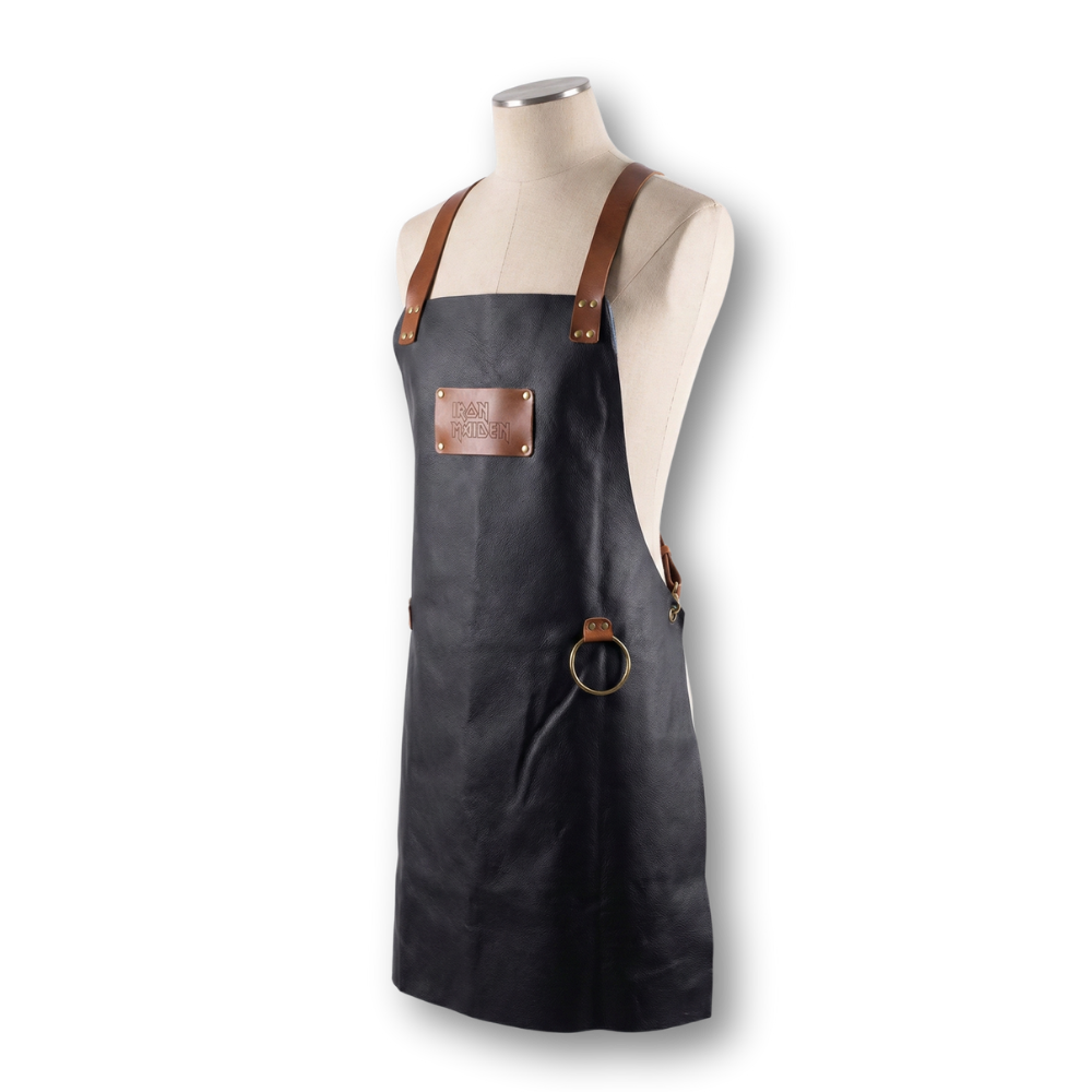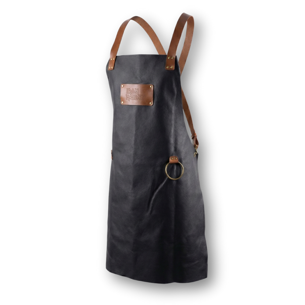 Avental artesanal em couro legítimo preto com personalização exclusiva Iron Maiden em relevo. Peça premium com alças em couro marrom ajustáveis, acabamento em rebites metálicos e argola lateral para pendurar utensílios.