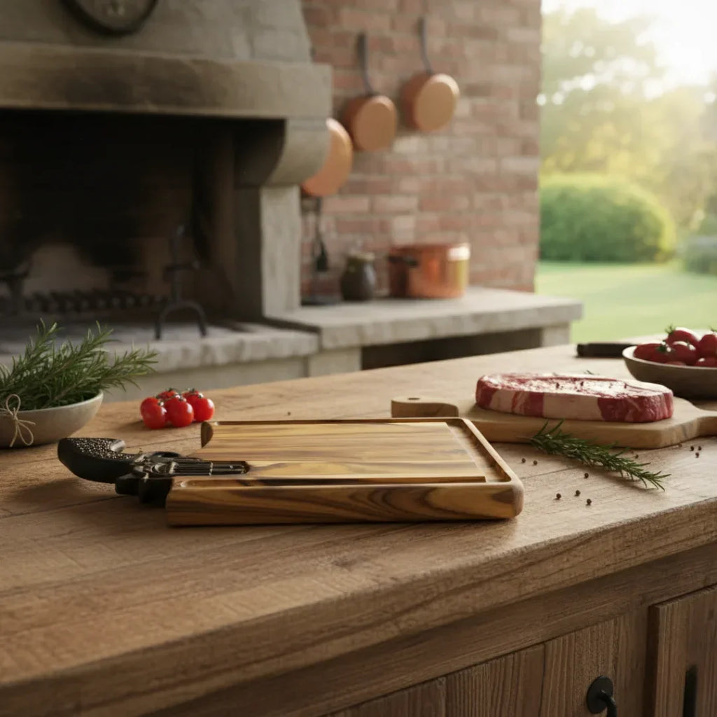 Esta tábua artesanal é muito mais que um utensílio - é uma peça de conversação! O cabo esculpido em formato de revólver torna cada churrasco especial e memorável. A madeira teka é naturalmente resistente à umidade e possui propriedades antibacterianas, ideal para uso com alimentos.