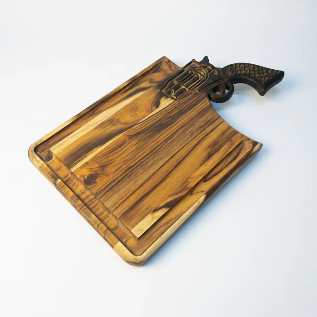 A Tábua de Churrasco Artesanal em madeira teka com cabo esculpido em formato de revólver é uma peça única que combina funcionalidade com design criativo. Perfeita para servir carnes com estilo e originalidade.