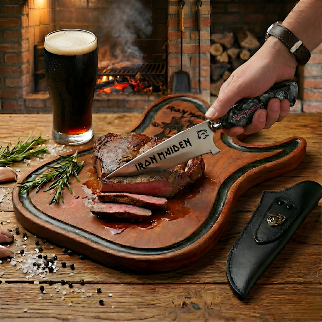 Tábua de corte artesanal 100% exclusiva com gravação do icônico mascote Eddie do Iron Maiden. Perfeita para quem une a paixão pelo rock clássico com o prazer de um bom churrasco.