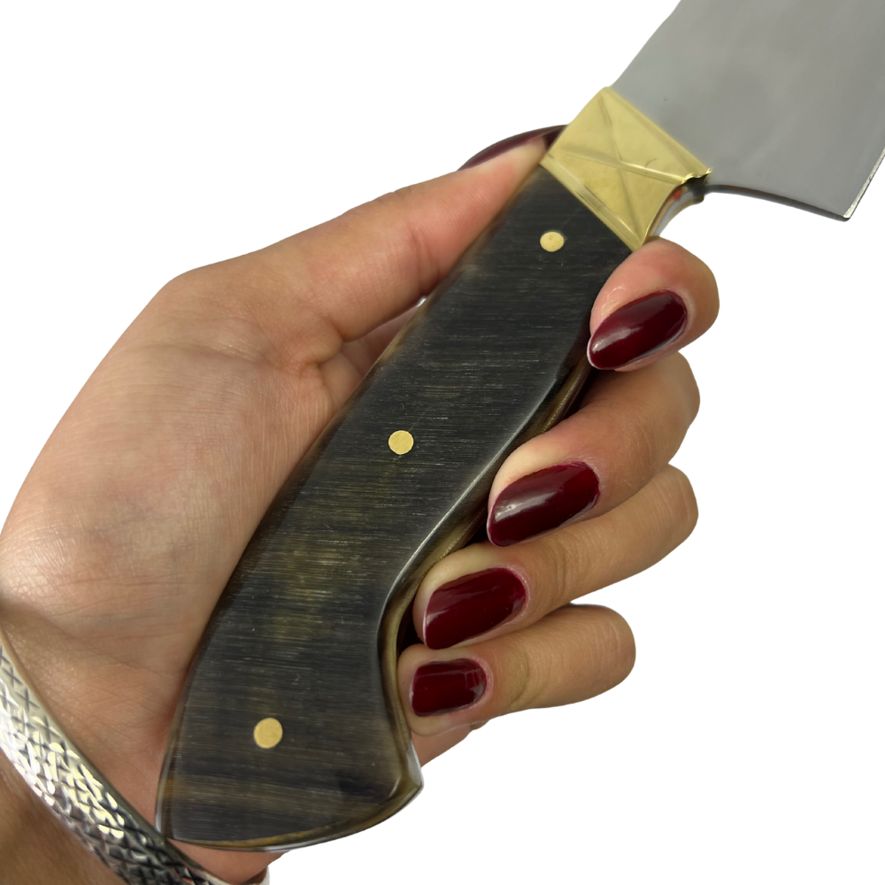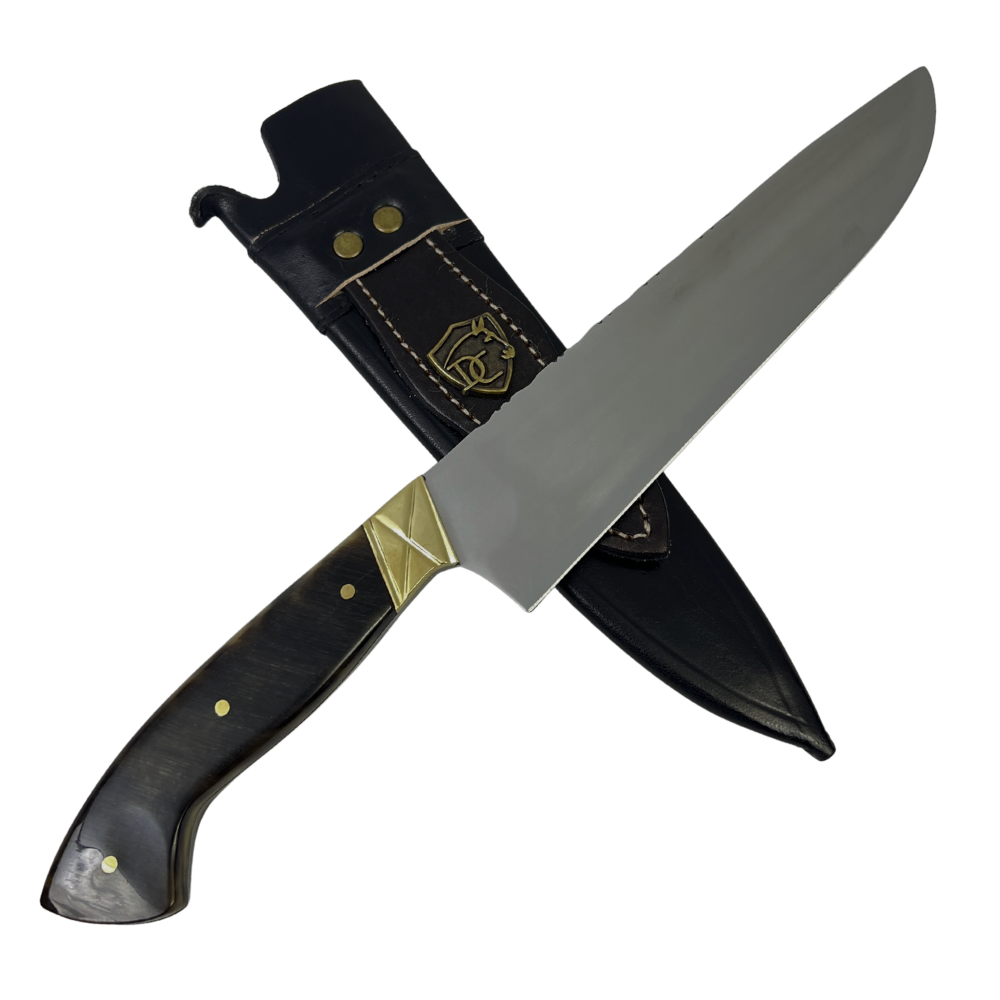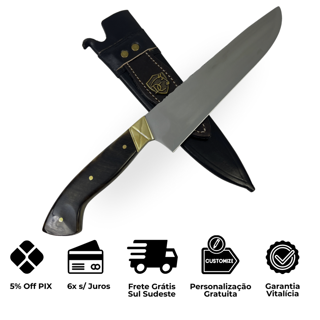 Faca artesanal premium 8 polegadas que une a tradição gaúcha com materiais nobres e construção superior. Perfeita para churrasco, cozinha profissional e uso diário.