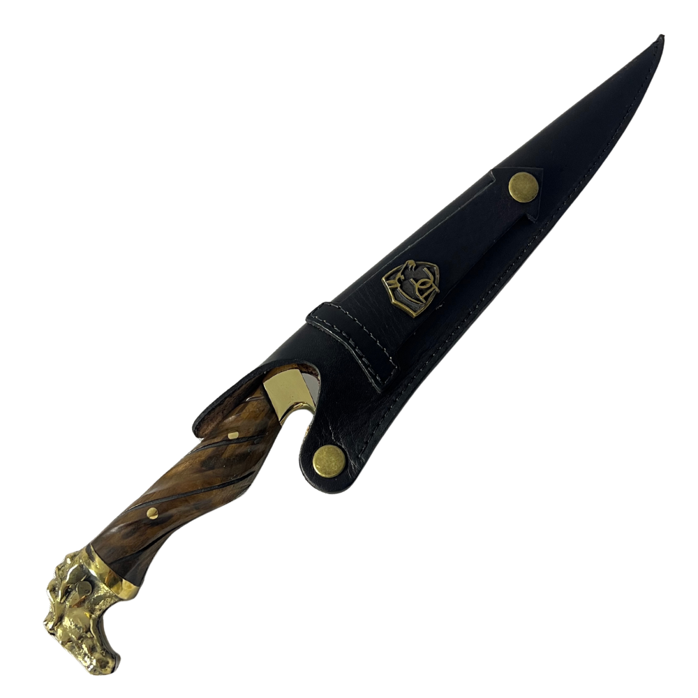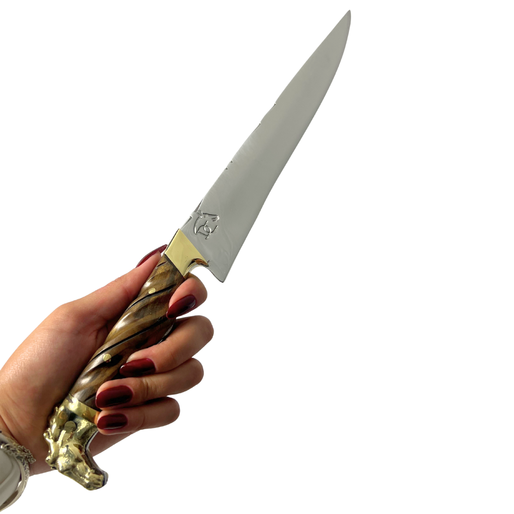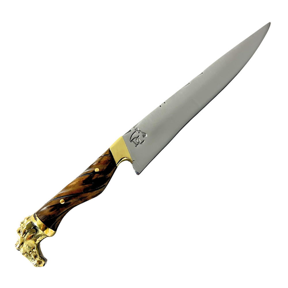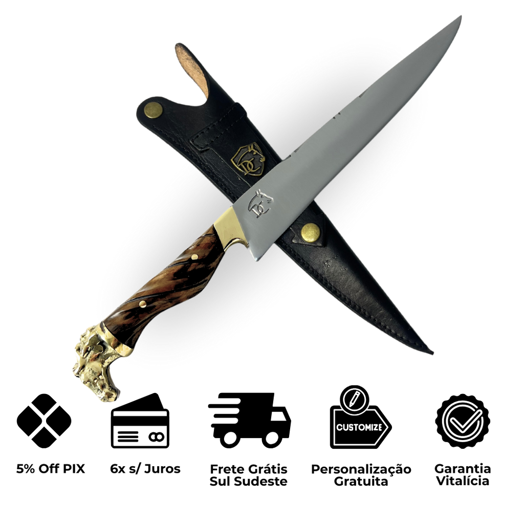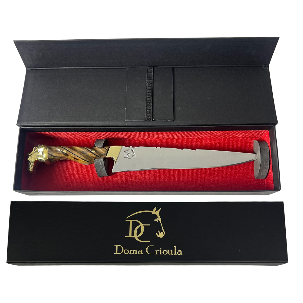 A guarda e o pomo em latão não são apenas decorativos - eles protegem a mão durante o uso e garantem equilíbrio perfeito. O pomo em formato de cabeça de cavalo é um detalhe que honra a tradição e torna cada peça especial.