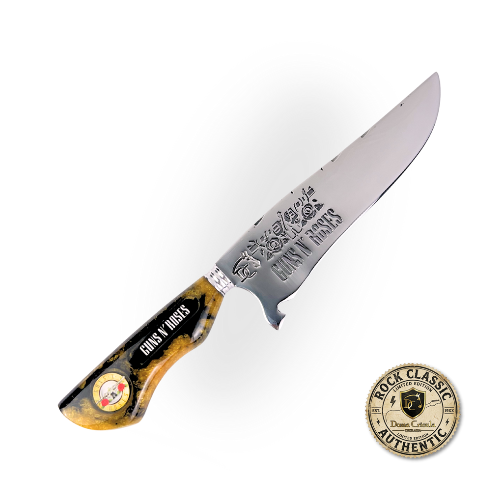 Se você cresceu ouvindo "Sweet Child O' Mine", "November Rain" e "Paradise City", esta faca foi feita para você. Uma peça que une duas paixões: rock'n'roll e boa comida. Perfeita para churrascos temáticos, jantares entre amigos ou simplesmente para ter uma peça única na sua coleção.