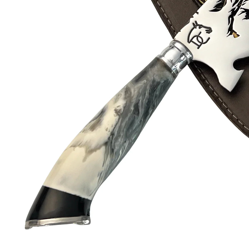 Paixão Campeira: Tema cavalo de fogo em resina exclusiva. Acompanha bainha de couro. Garantia vitalícia. Presente perfeito para cavaleiros.