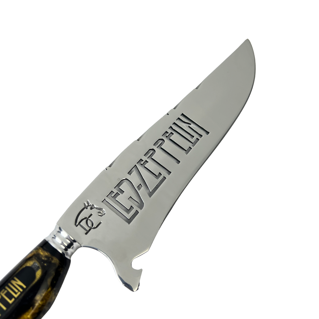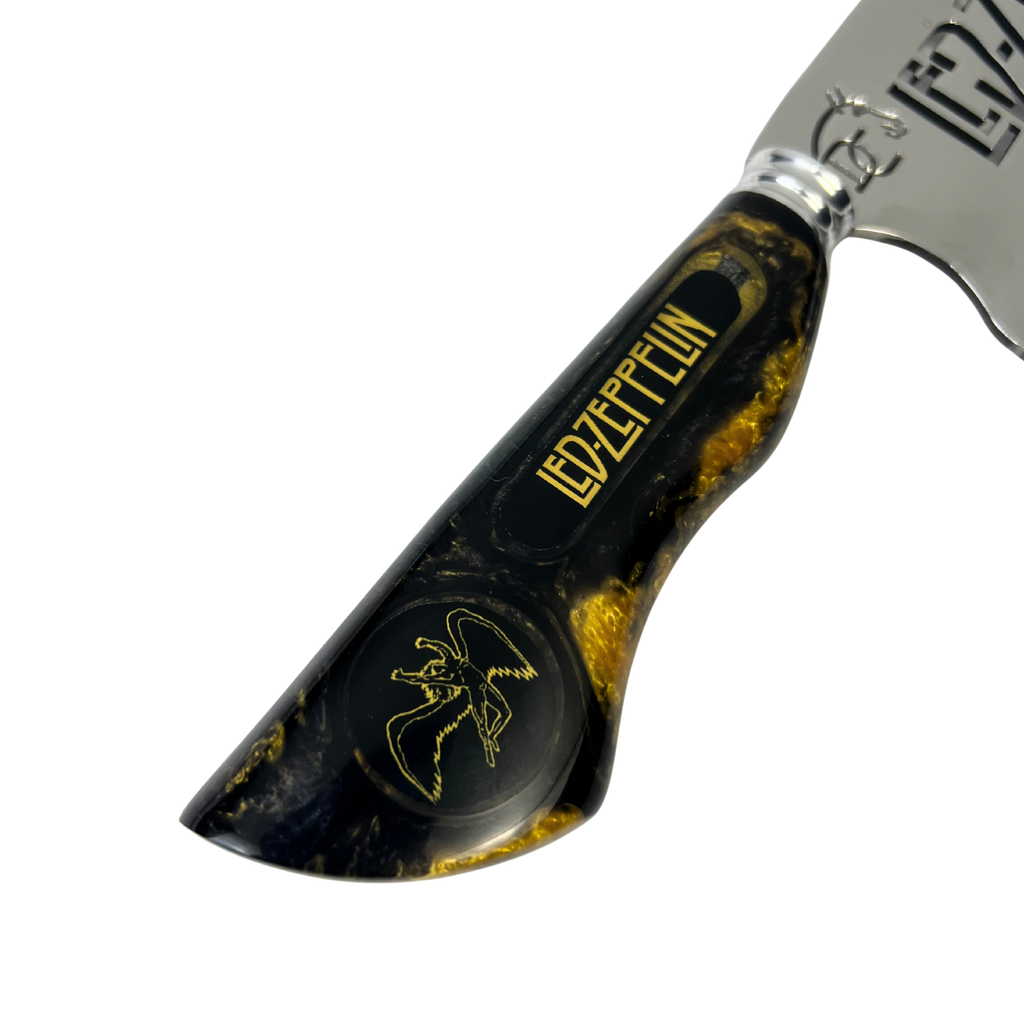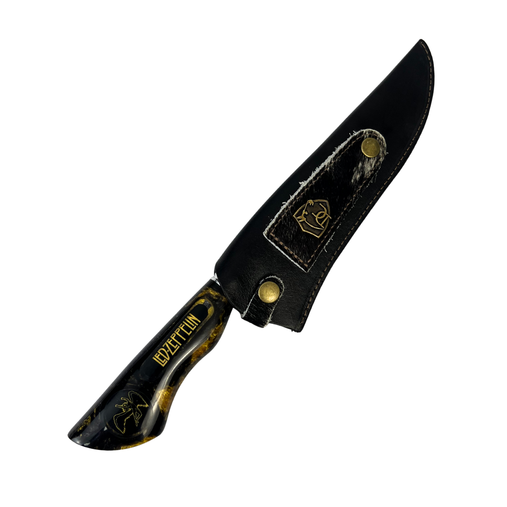 Faca Picanheira 8" Led Zeppelin - Cabo Resina Preta e Dourada - uma peça exclusiva para fãs da lendária banda de rock.