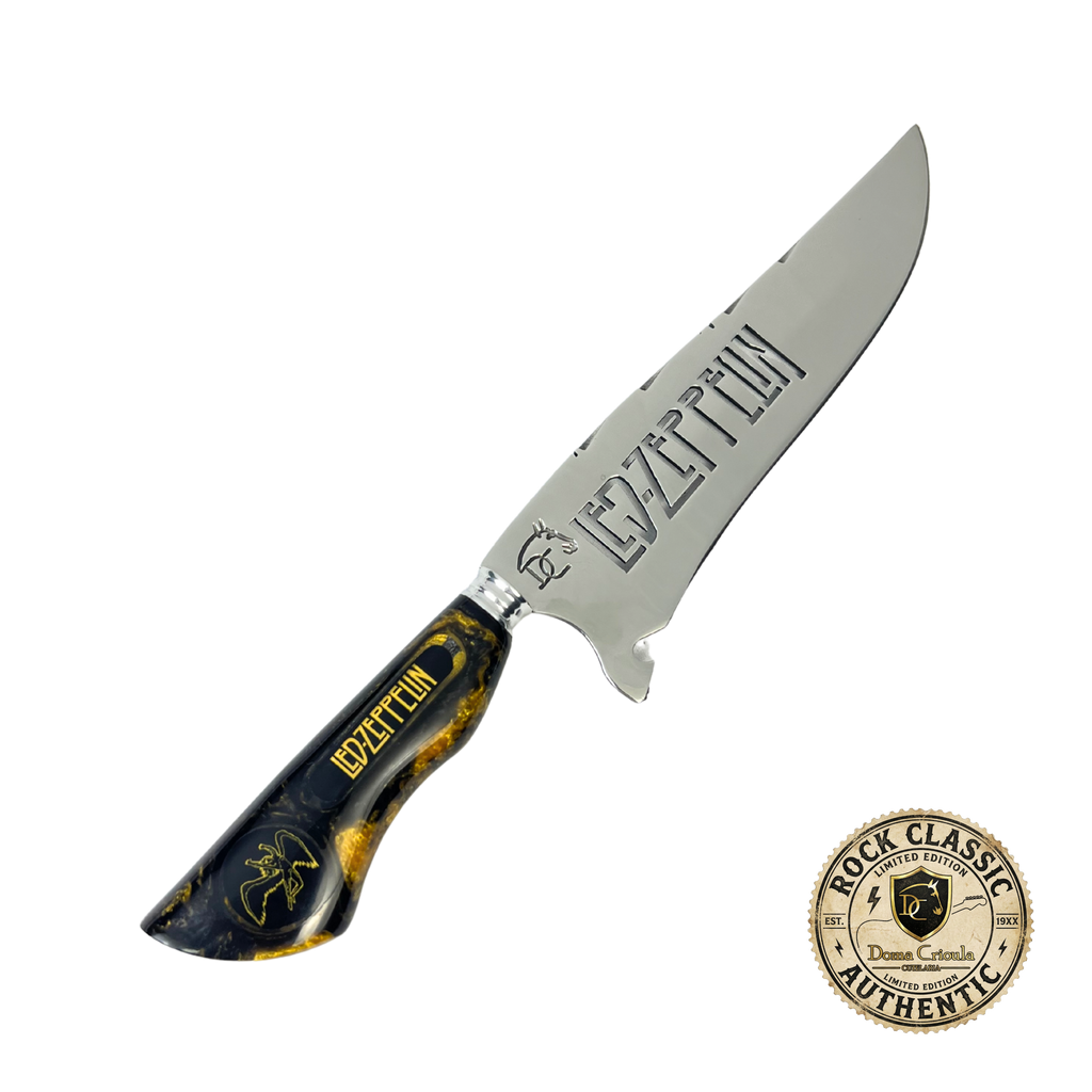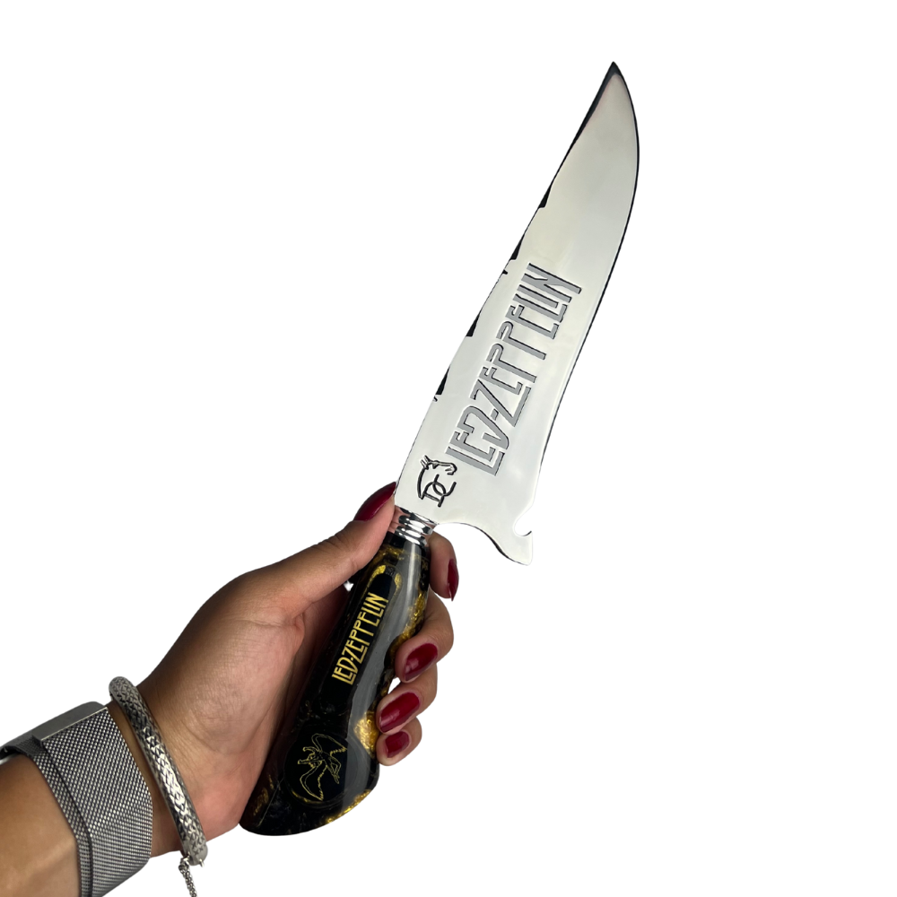 Esta faca picanheira celebra uma das maiores bandas de rock de todos os tempos. O cabo artesanal em resina combina tons preto e dourado, cores icônicas que remetem à estética clássica do Led Zeppelin. O símbolo da banda está incrustado no cabo em resina, criando um visual marcante e exclusivo.