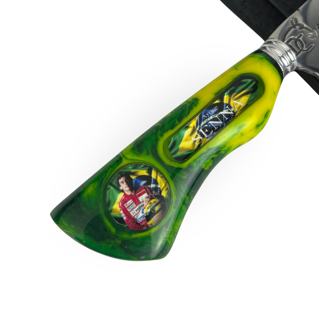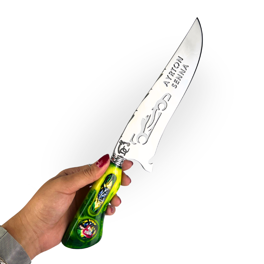 O cabo em resina com tons de verde e amarelo não é apenas uma homenagem visual - representa a paixão brasileira pelo automobilismo e pelo churrasco. Cada detalhe foi pensado para criar uma peça que Senna ficaria orgulhoso de ter em sua mesa.