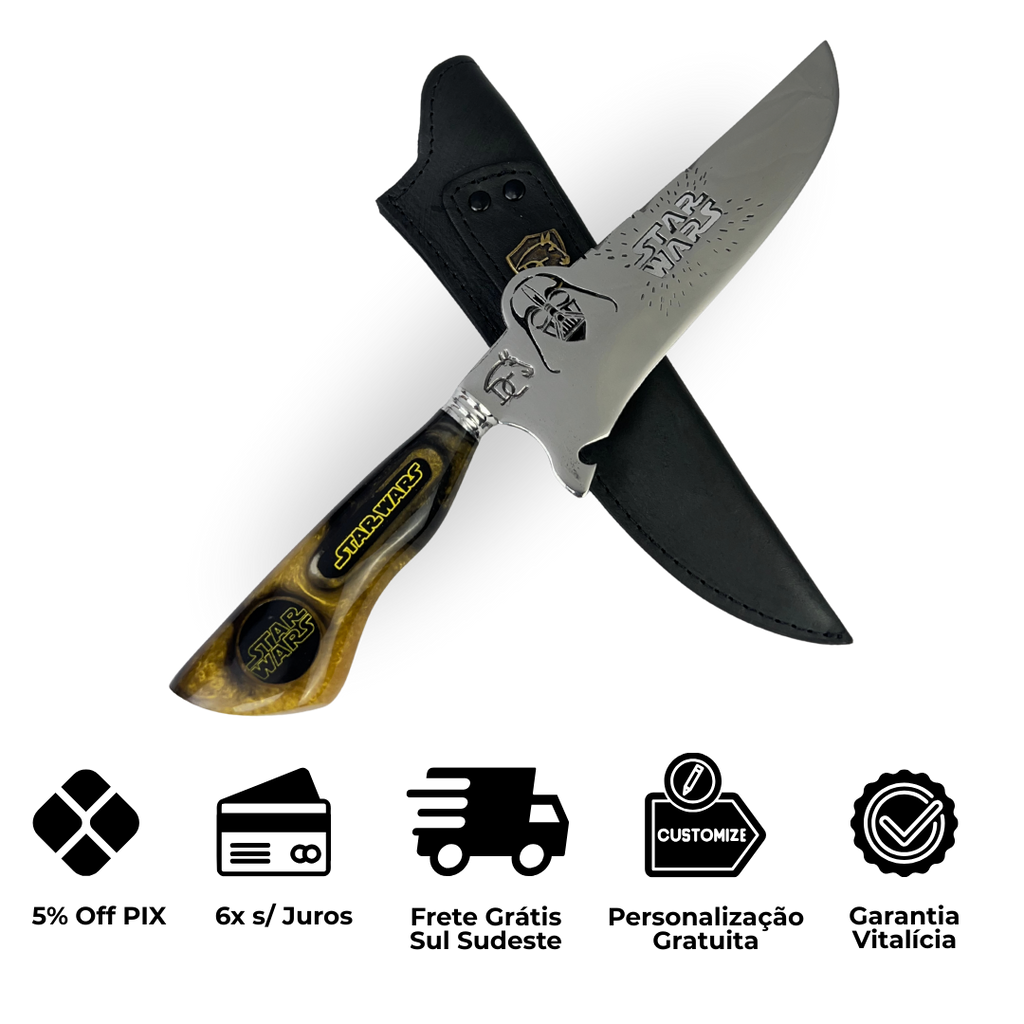 A Faca Star Wars Darth Vader celebra o vilão mais icônico da história do cinema. Com design exclusivo e acabamento premium em resina marmorizada dourada e preta, esta peça artesanal traz o poder do lado sombrio da Força direto para sua coleção.