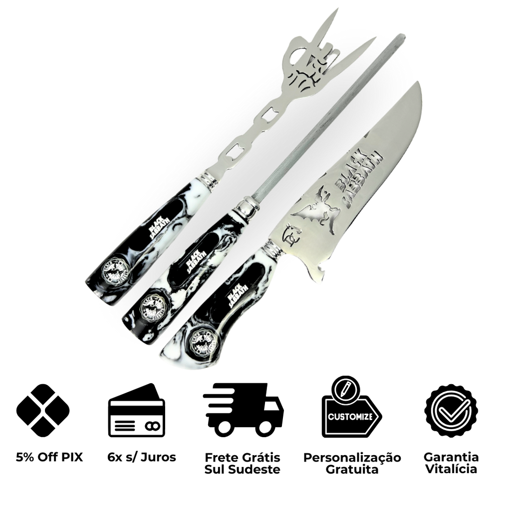 Kit churrasco premium 3 peças artesanais que une a tradição gaúcha com a energia do rock. Perfeito para churrasqueiros que valorizam exclusividade e performance.