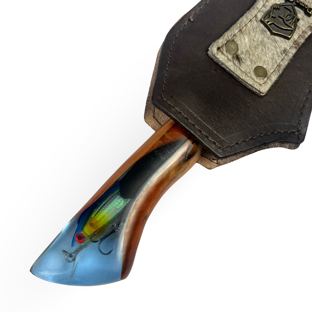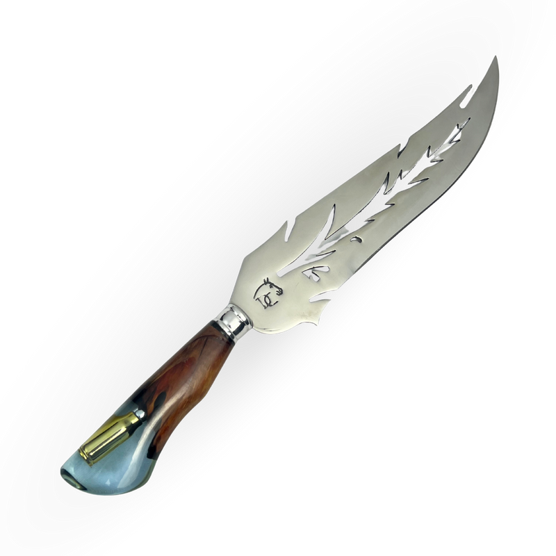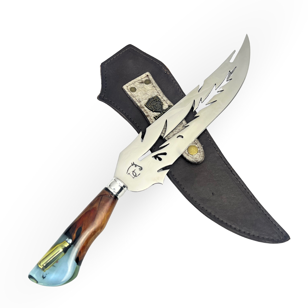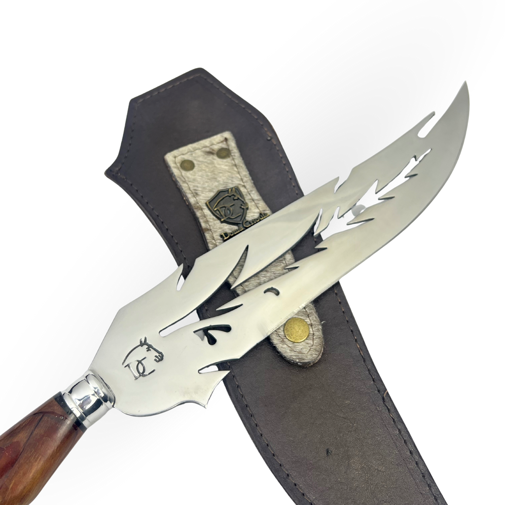 Esta faca combina funcionalidade com arte, apresentando um design diferenciado que a torna uma peça de destaque em qualquer coleção. O formato de folha vazado na lâmina não é apenas esteticamente impressionante, mas também demonstra a habilidade e precisão do artesão.