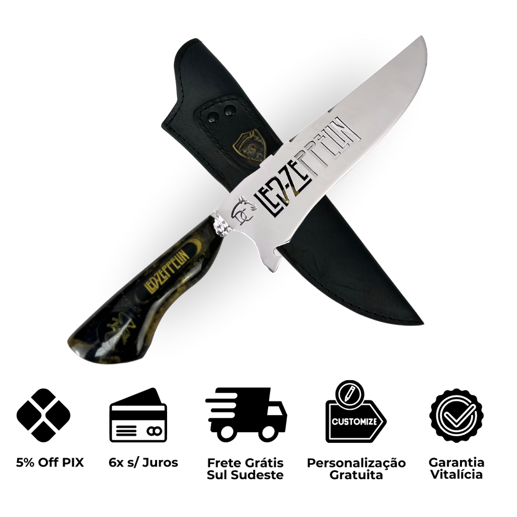 Faca Picanheira 8" Led Zeppelin - Cabo Resina Preta e Dourada - uma peça exclusiva para fãs da lendária banda de rock.