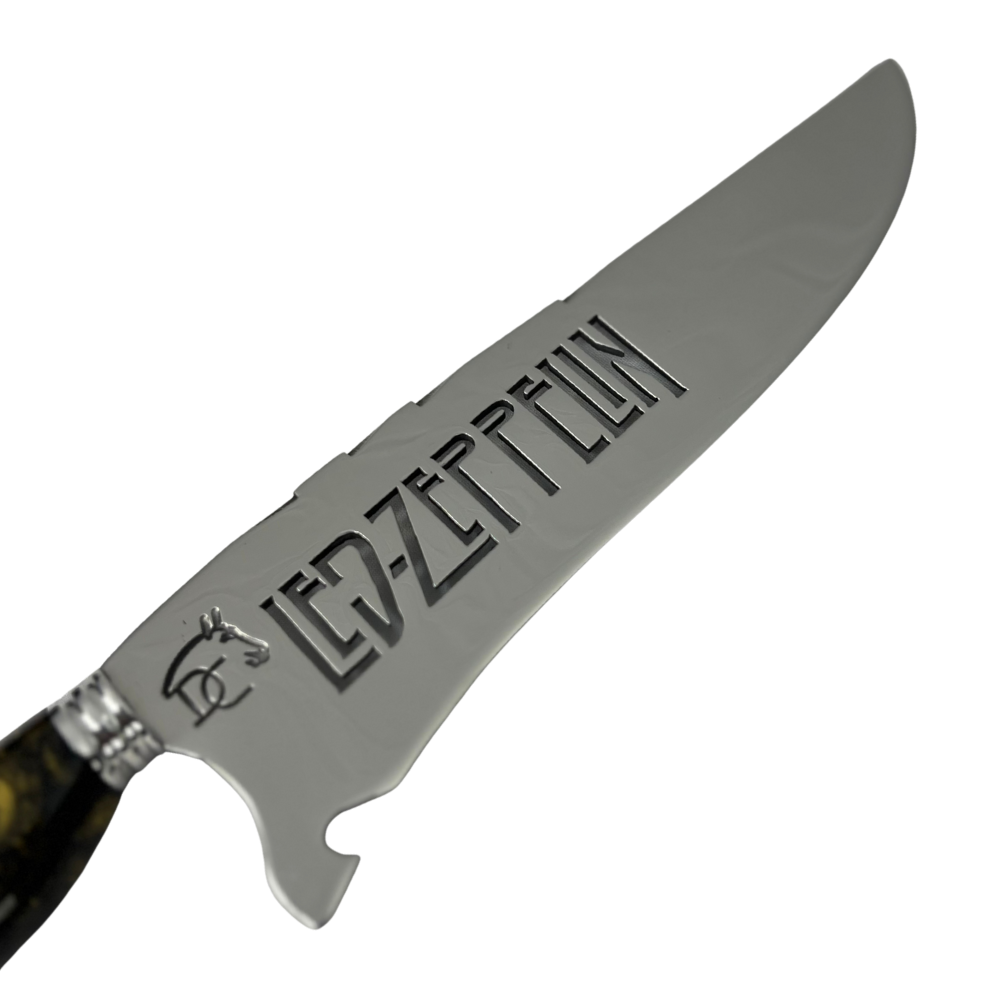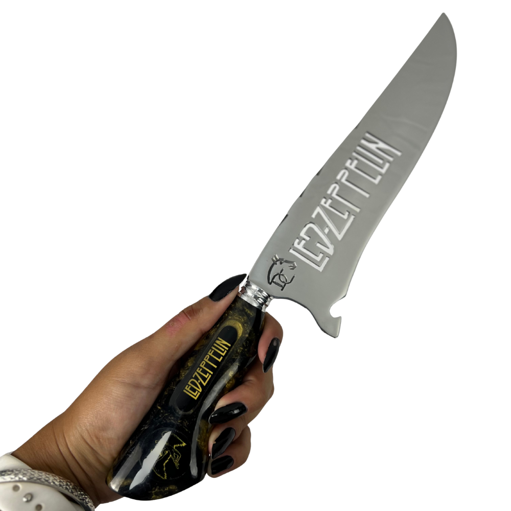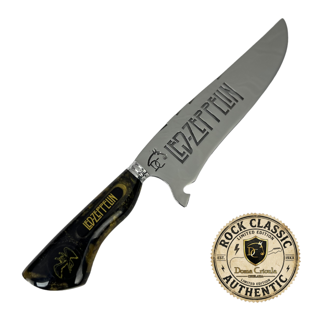 Esta faca picanheira celebra uma das maiores bandas de rock de todos os tempos. O cabo artesanal em resina combina tons preto e dourado, cores icônicas que remetem à estética clássica do Led Zeppelin. O símbolo da banda está incrustado no cabo em resina, criando um visual marcante e exclusivo.