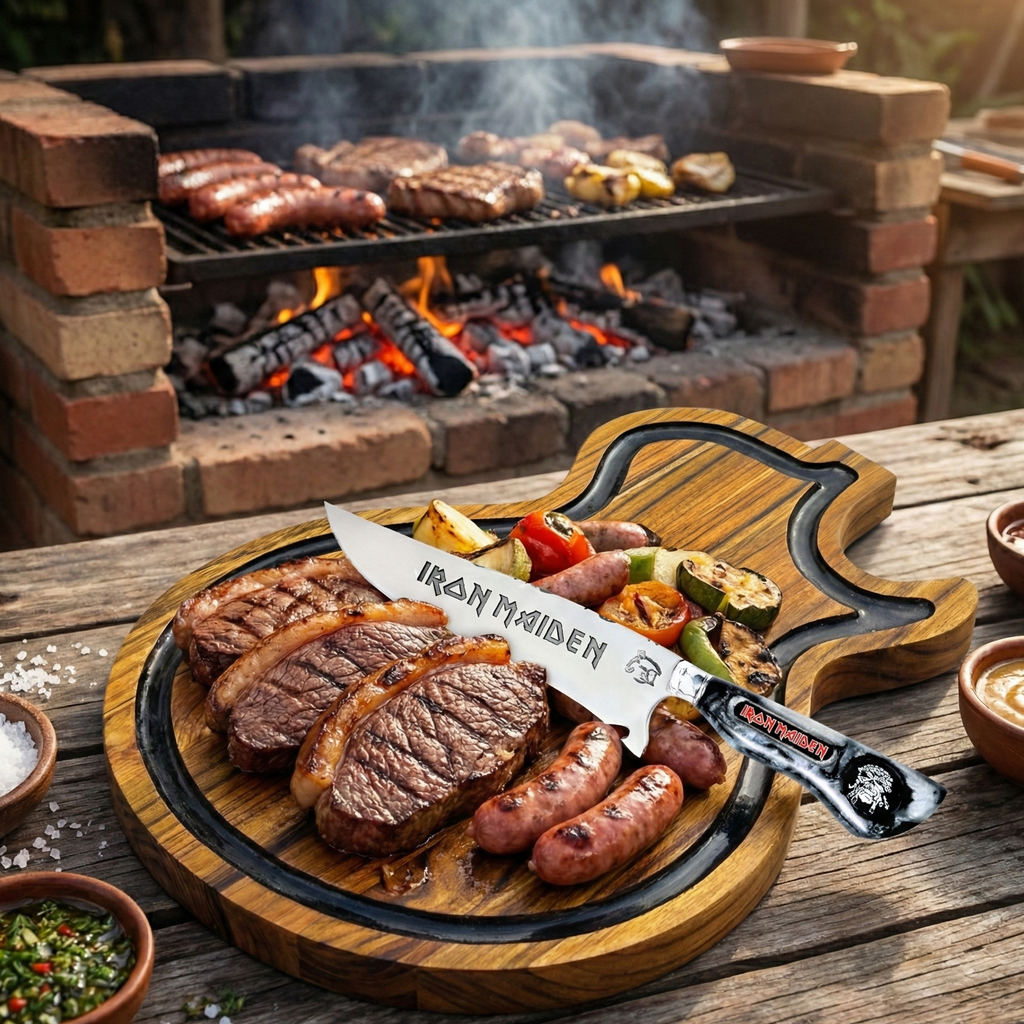 Presente exclusivo para fãs de Iron Maiden e rock clássico, churrasqueiros que curtem personalidade, decoração de cozinha gourmet, item de colecionador, presente de aniversário ou Natal diferenciado.