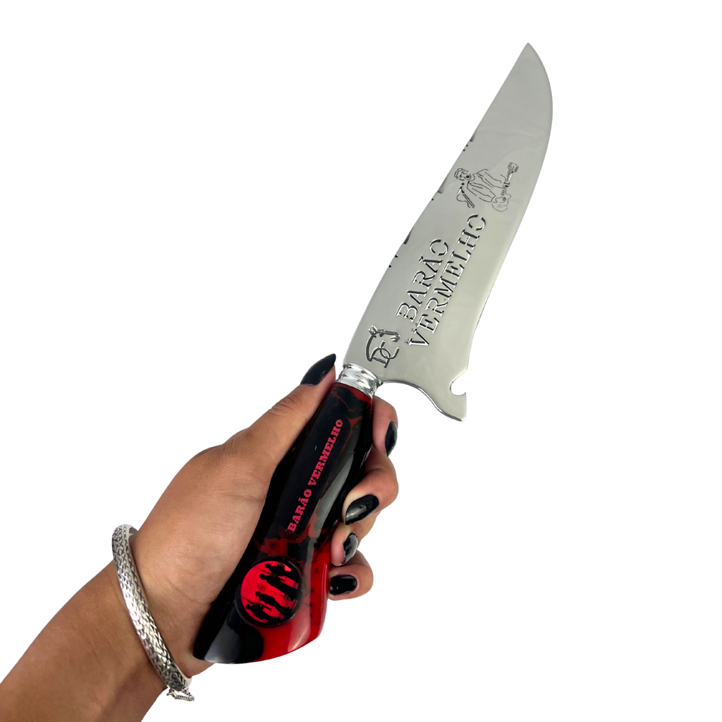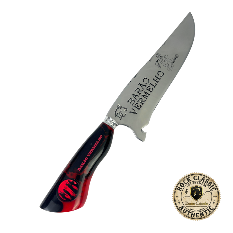 Sua lâmina de 8 polegadas com vazado temático exibe o nome Barão Vermelho em alto relevo, enquanto o cabo em resina preta com detalhes vermelhos sangue traz o logo icônico da banda e o texto "BARÃO VERMELHO" em destaque. O contraste entre preto e vermelho cria um visual marcante que reflete a intensidade e a paixão do rock nacional.