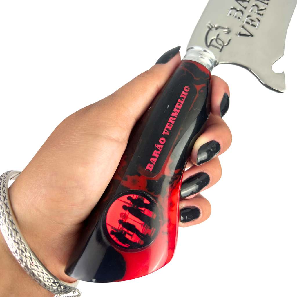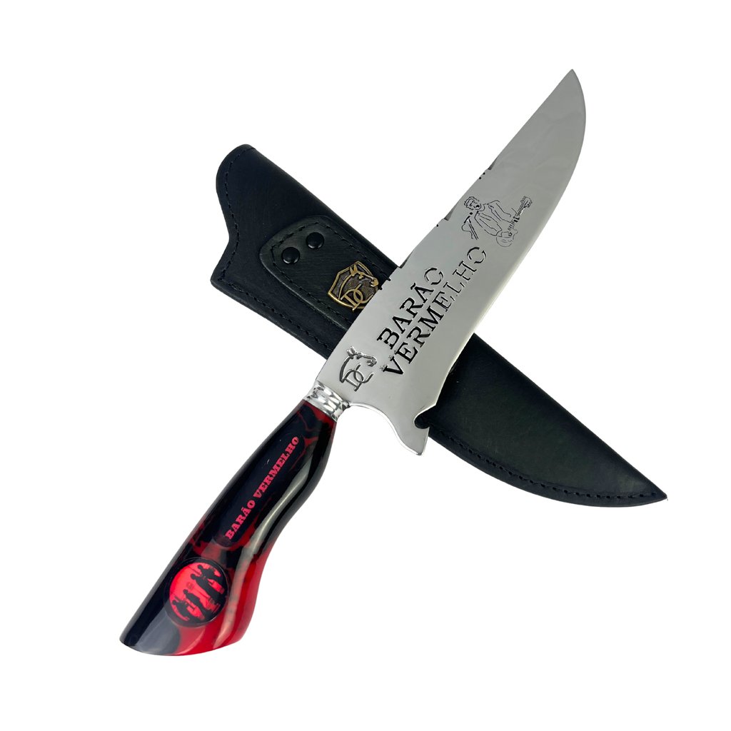 - Lâmina: 8 polegadas (≈20cm) com vazado temático Barão Vermelho