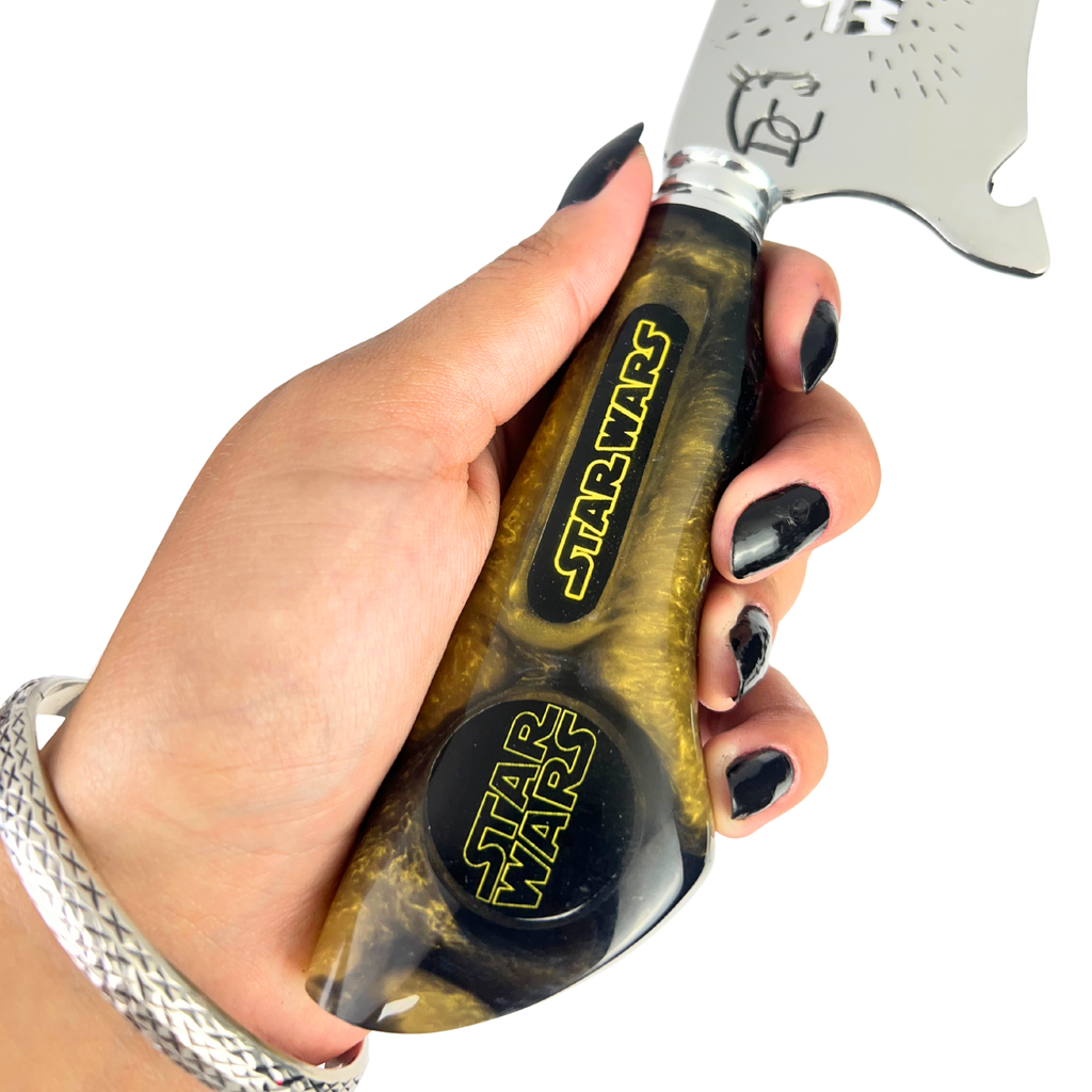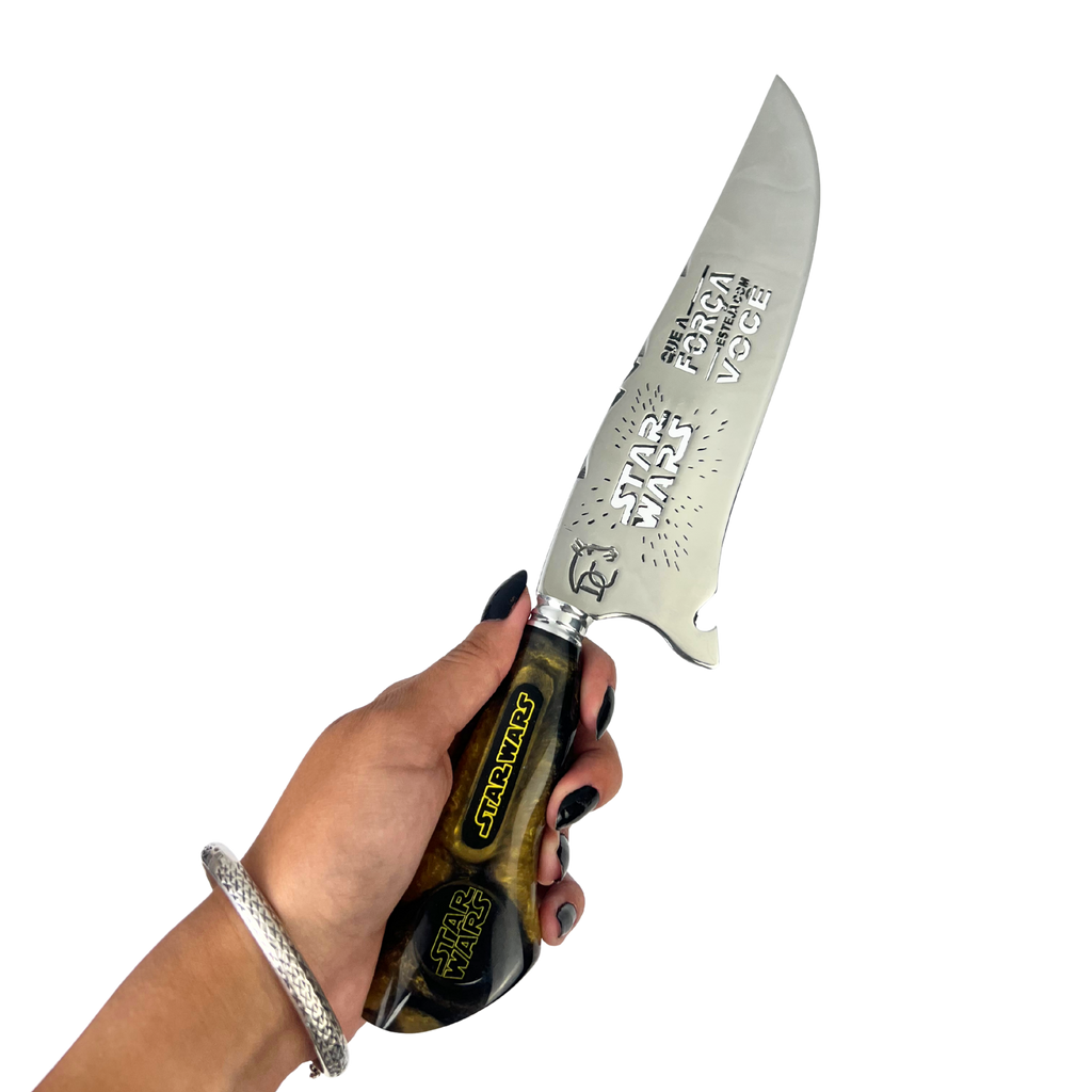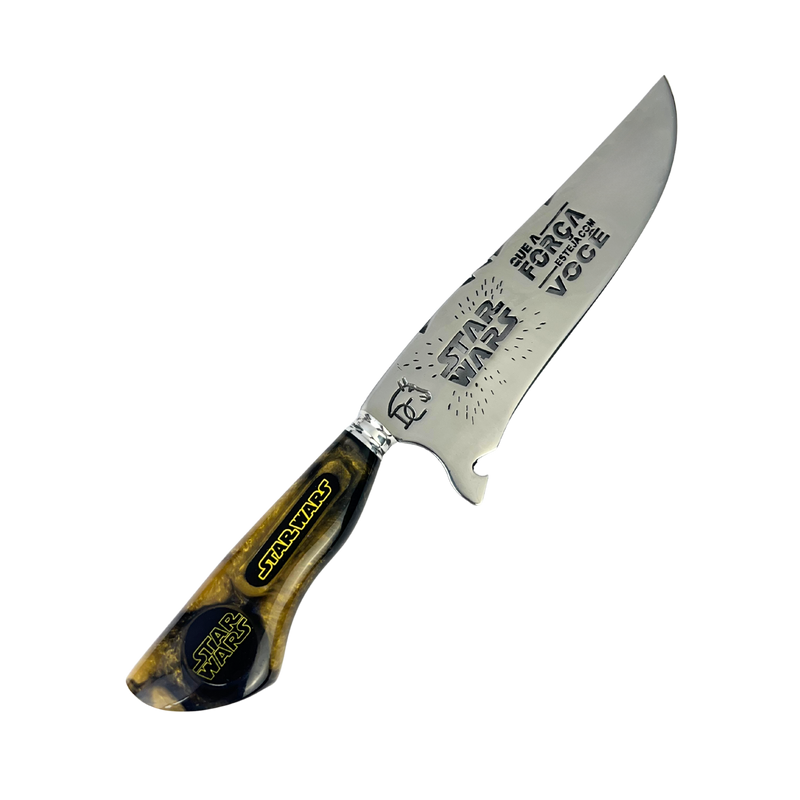 A Faca Star Wars é uma homenagem épica à saga que conquistou gerações. Com design exclusivo e acabamento premium em resina marmorizada dourada e preta, esta peça artesanal traz a força da galáxia muito, muito distante direto para sua coleção.
