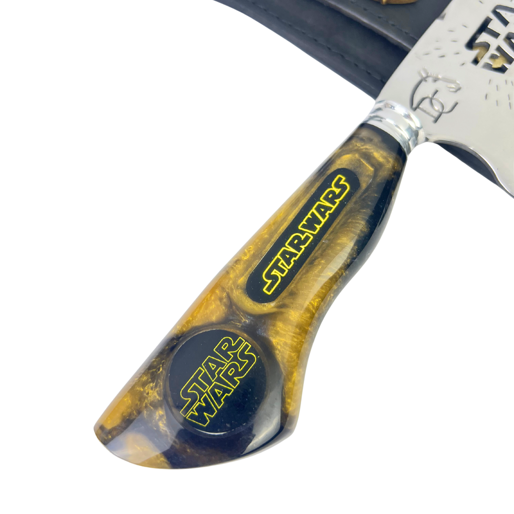 Sua lâmina de 8 polegadas com vazado temático exibe o icônico logo Star Wars em alto relevo, enquanto o cabo em resina marmorizada dourada e preta apresenta o logo da saga em destaque. O padrão marmorizado único com tons dourados remete ao brilho dos sabres de luz, criando uma peça exclusiva e irrepetível para verdadeiros fãs da saga.