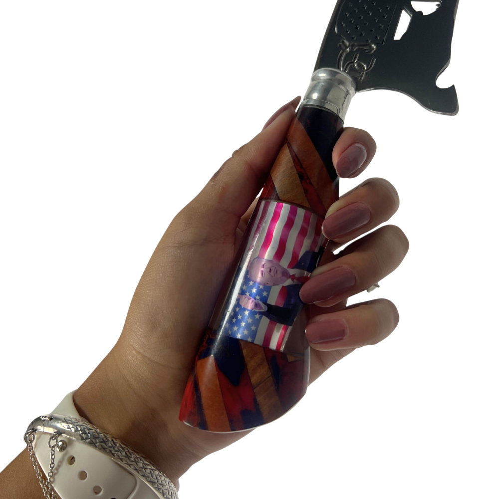 • Cabo: Resina artesanal com bandeira americana e imagem de Trump