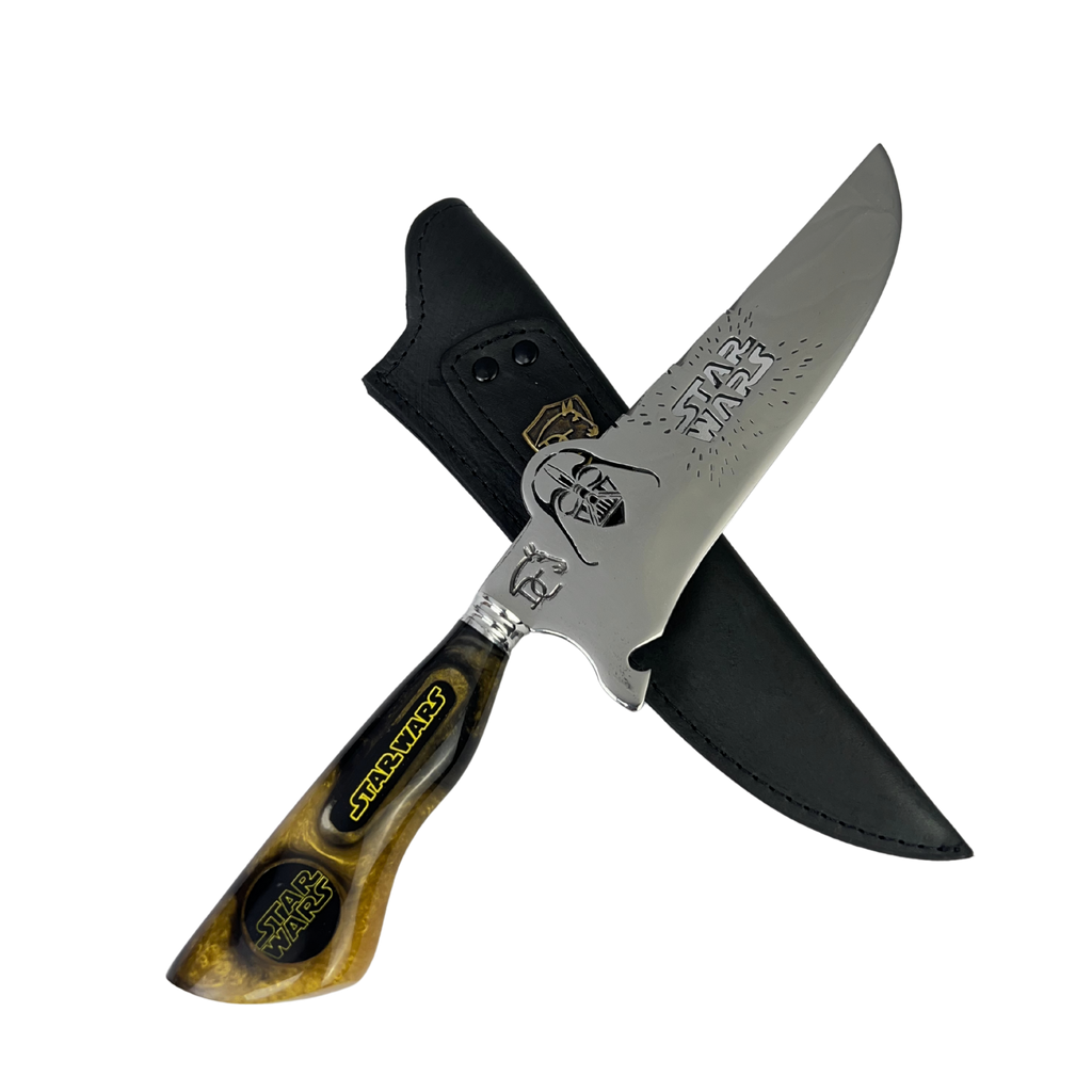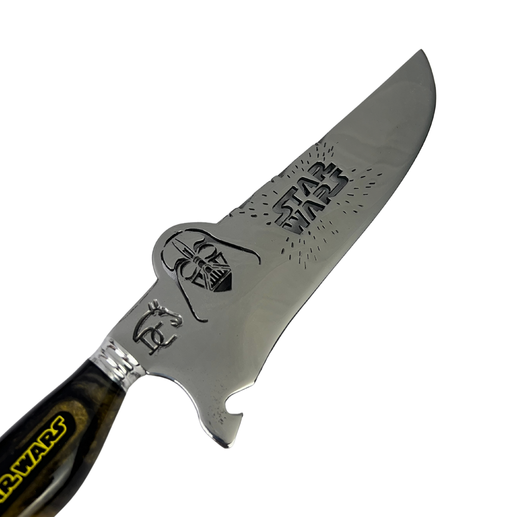 Sua lâmina de 8 polegadas com vazado temático exibe o icônico logo Star Wars em alto relevo com a máscara de Darth Vader, enquanto o cabo em resina marmorizada dourada e preta apresenta o logo da saga e o texto "STAR WARS" em destaque. O padrão marmorizado único com tons dourados remete ao brilho dos sabres de luz, criando uma peça exclusiva para verdadeiros fãs do Império.