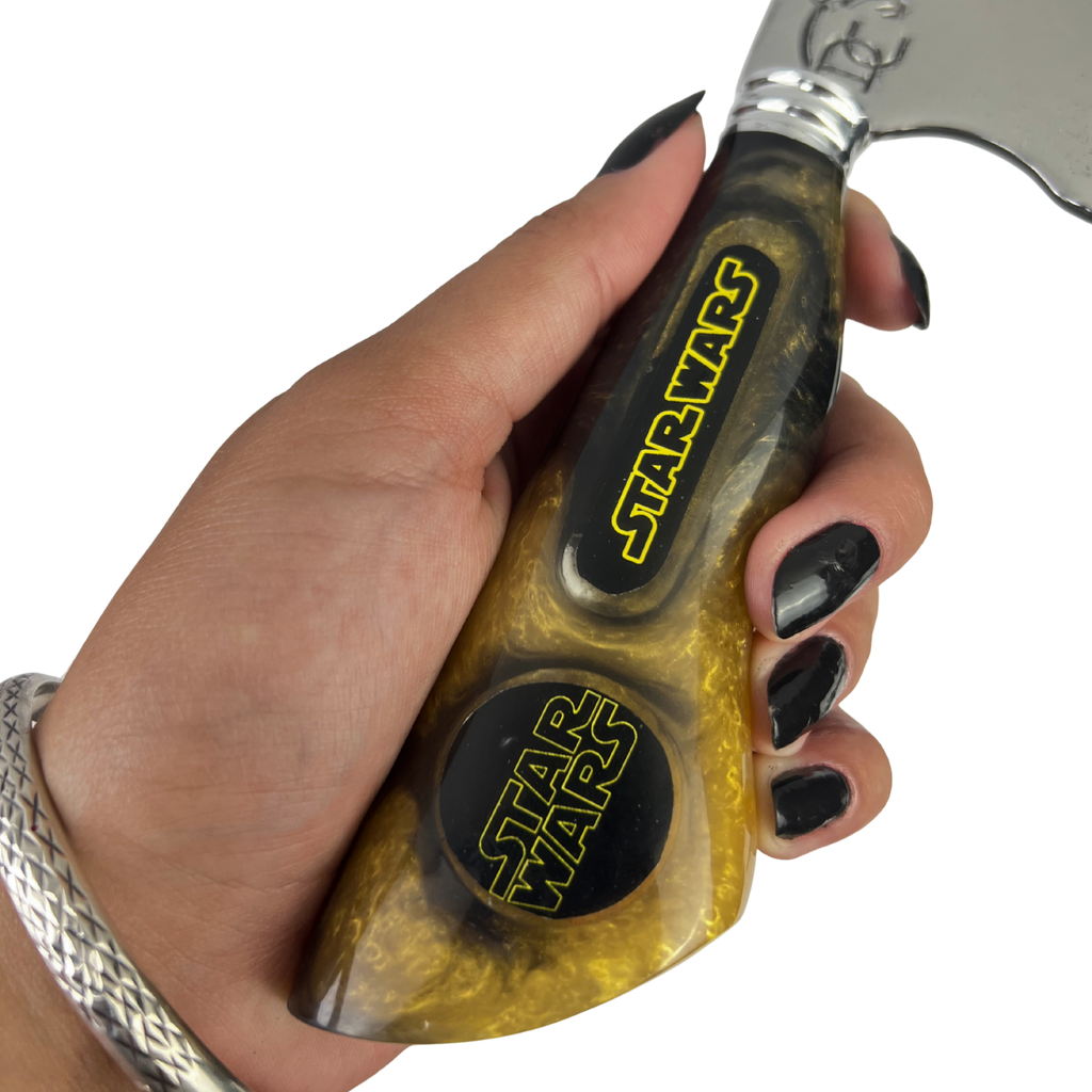 A Faca Star Wars Darth Vader celebra o vilão mais icônico da história do cinema. Com design exclusivo e acabamento premium em resina marmorizada dourada e preta, esta peça artesanal traz o poder do lado sombrio da Força direto para sua coleção.