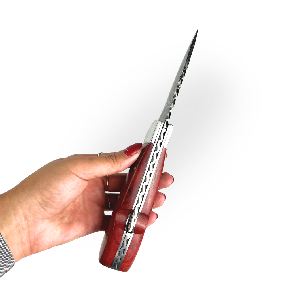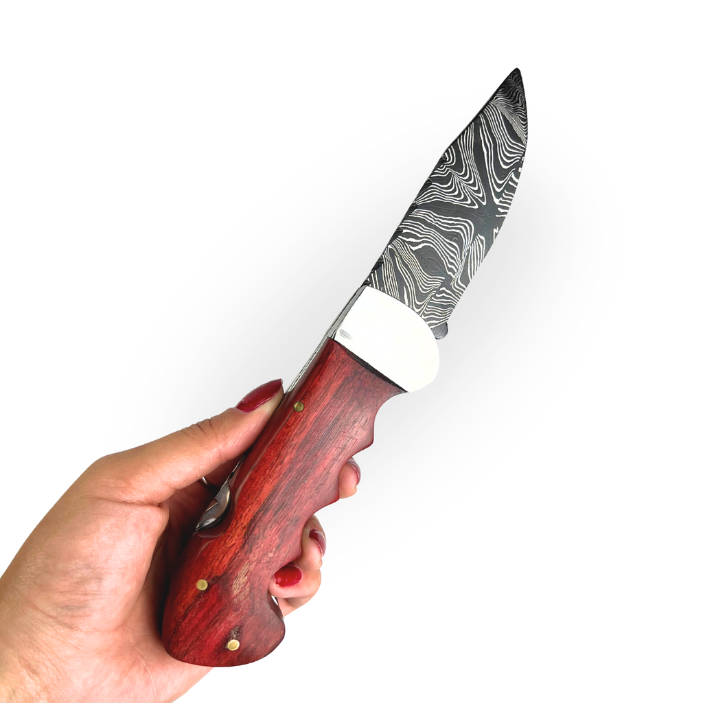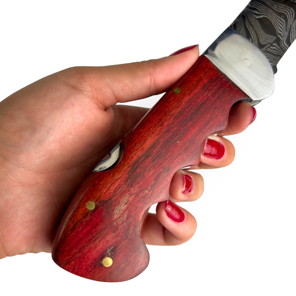 O cabo é confeccionado em madeira cuidadosamente selecionada, com tonalidade avermelhada natural e grãos que complementam perfeitamente o padrão damasco da lâmina. O acabamento premium oferece pegada confortável, segura e beleza atemporal.