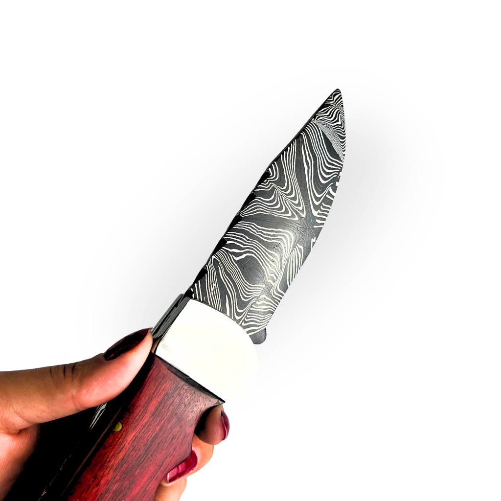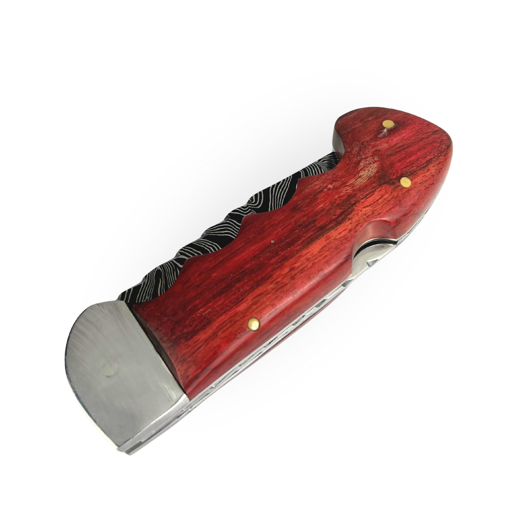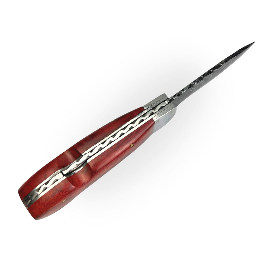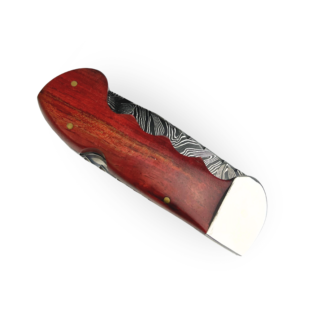 O cabo é confeccionado em madeira cuidadosamente selecionada, com tonalidade avermelhada natural e grãos que complementam perfeitamente o padrão damasco da lâmina. O acabamento premium oferece pegada confortável, segura e beleza atemporal.