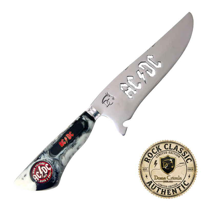 Para os verdadeiros fãs de rock que apreciam cutelaria de alta qualidade! Esta faca exclusiva traz toda a energia e atitude da lendária banda AC/DC, combinando artesanato premium com o espírito do rock'n'roll.