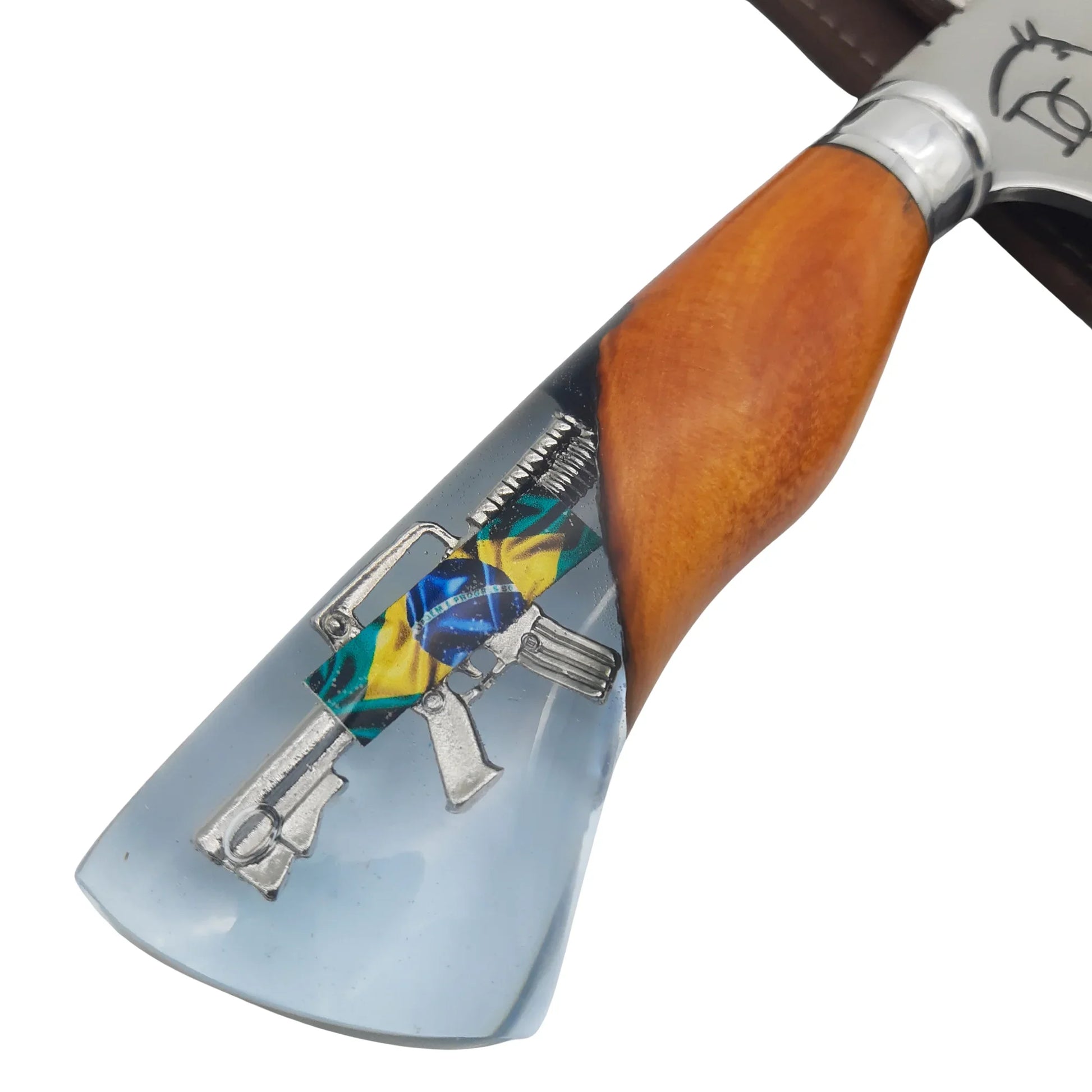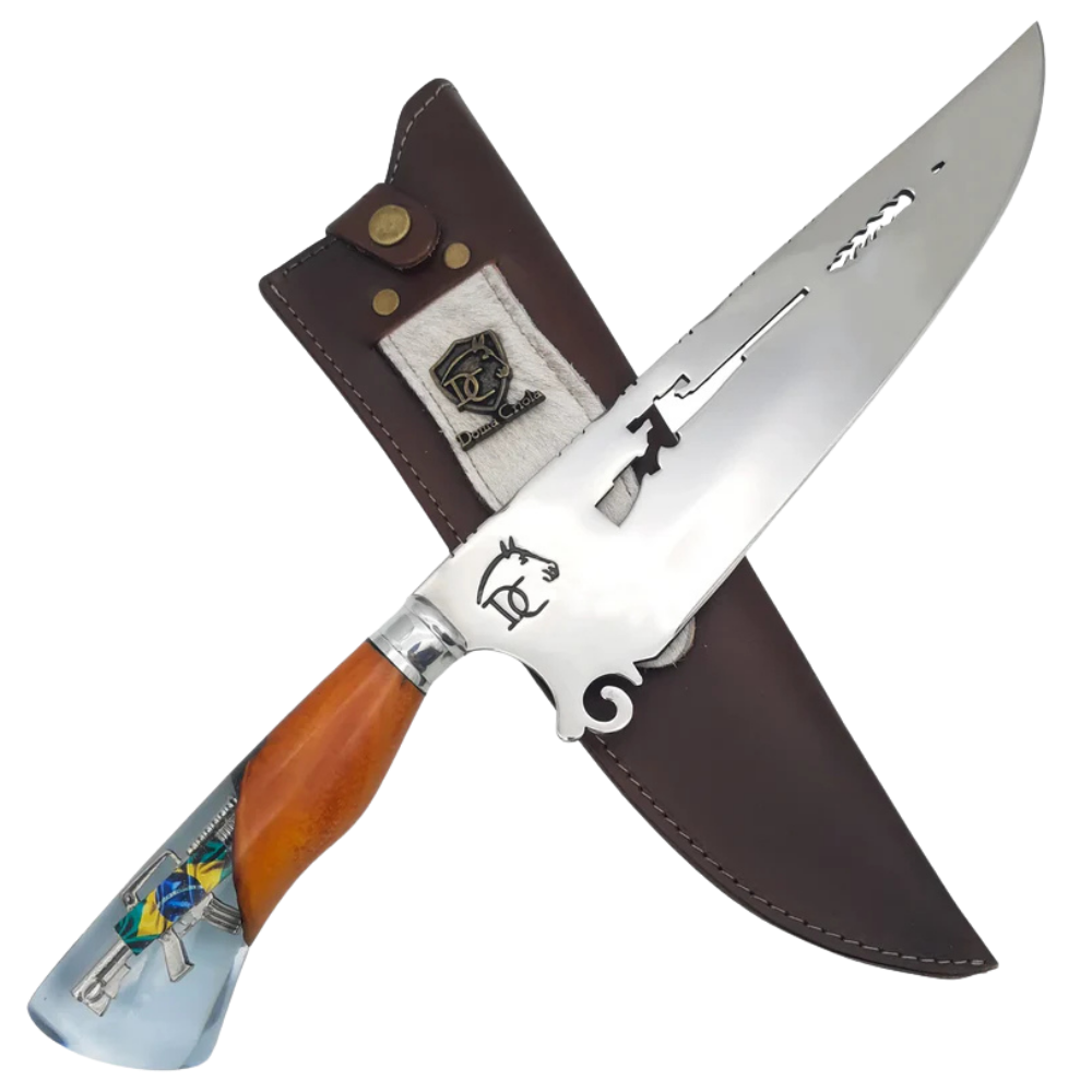 Orgulho Brasileiro: Bandeira do Brasil encapsulada em resina. Linha Sniper premium. Acompanha bainha de couro. Garantia vitalícia. Peça patriótica exclusiva.