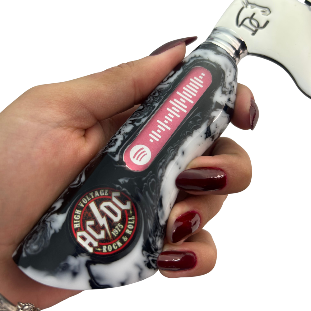 O cabo em resina marmorizada preto e branco possui efeito premium que remete ao mármore natural, criando um visual sofisticado e único. O logo AC/DC "High Voltage Rock 'n' Roll" em vermelho e preto adiciona personalidade e atitude rock 'n' roll à peça. O código Spotify em rosa vibrante se destaca no design.