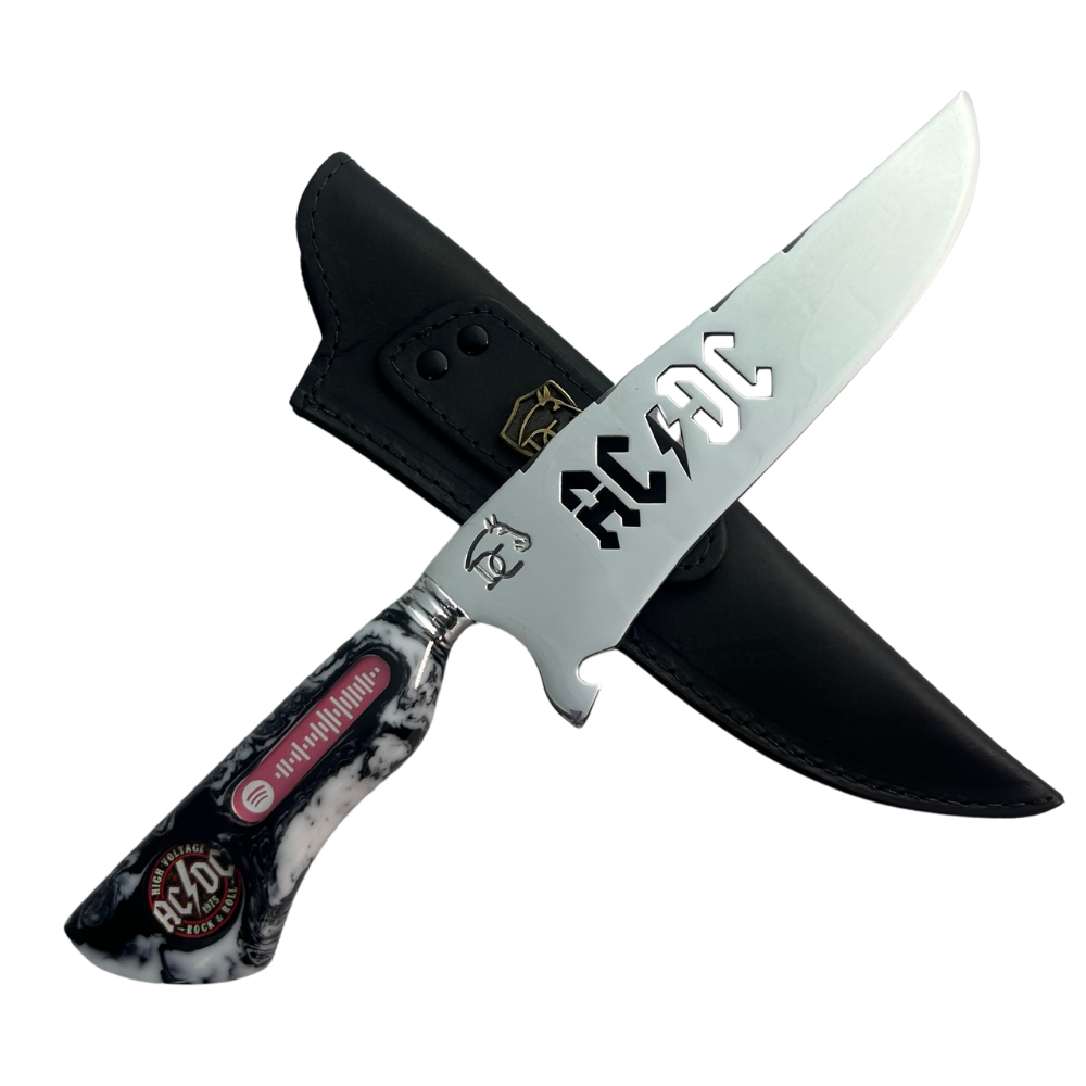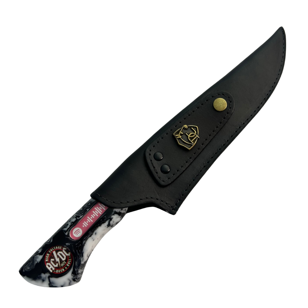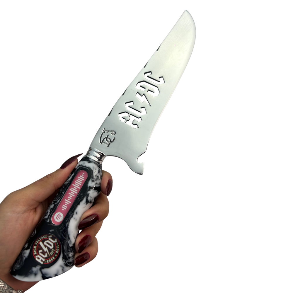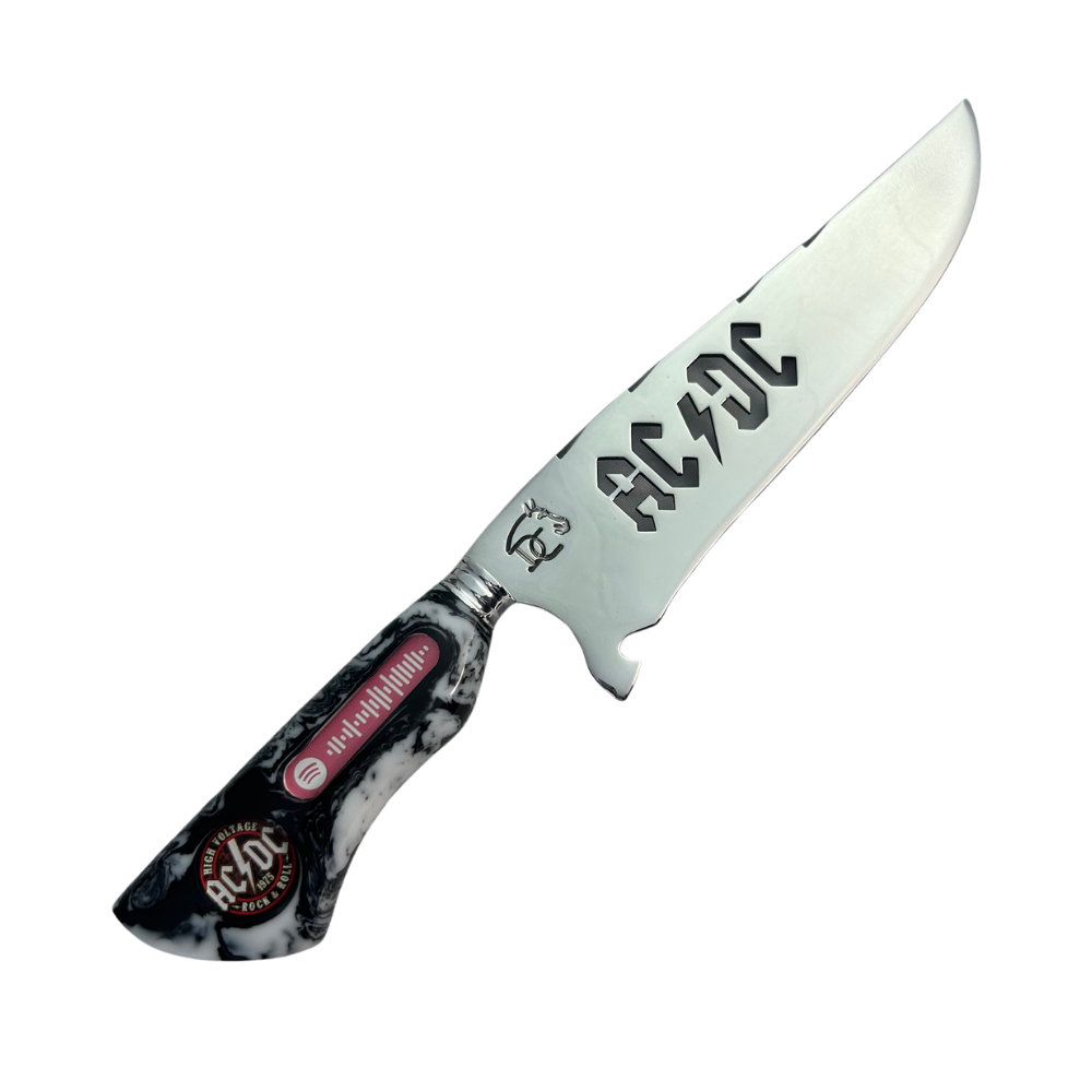 Faca artesanal premium 8 polegadas AC/DC com código Spotify embutido - uma peça exclusiva que une a lendária banda de rock com a tradição gaúcha do churrasco. Perfeita para fãs de AC/DC, colecionadores e churrasqueiros que não abrem mão de estilo e qualidade.