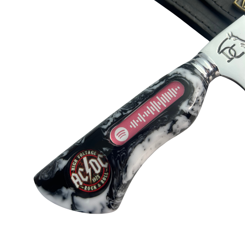 Esta faca possui um diferencial único e inovador: um código Spotify embutido no cabo em resina. Basta escanear o código com o aplicativo Spotify no seu smartphone para ser direcionado automaticamente para a playlist oficial do AC/DC. Curta os maiores sucessos da banda enquanto prepara seu churrasco - Highway to Hell, Back in Black, Thunderstruck e muito mais!