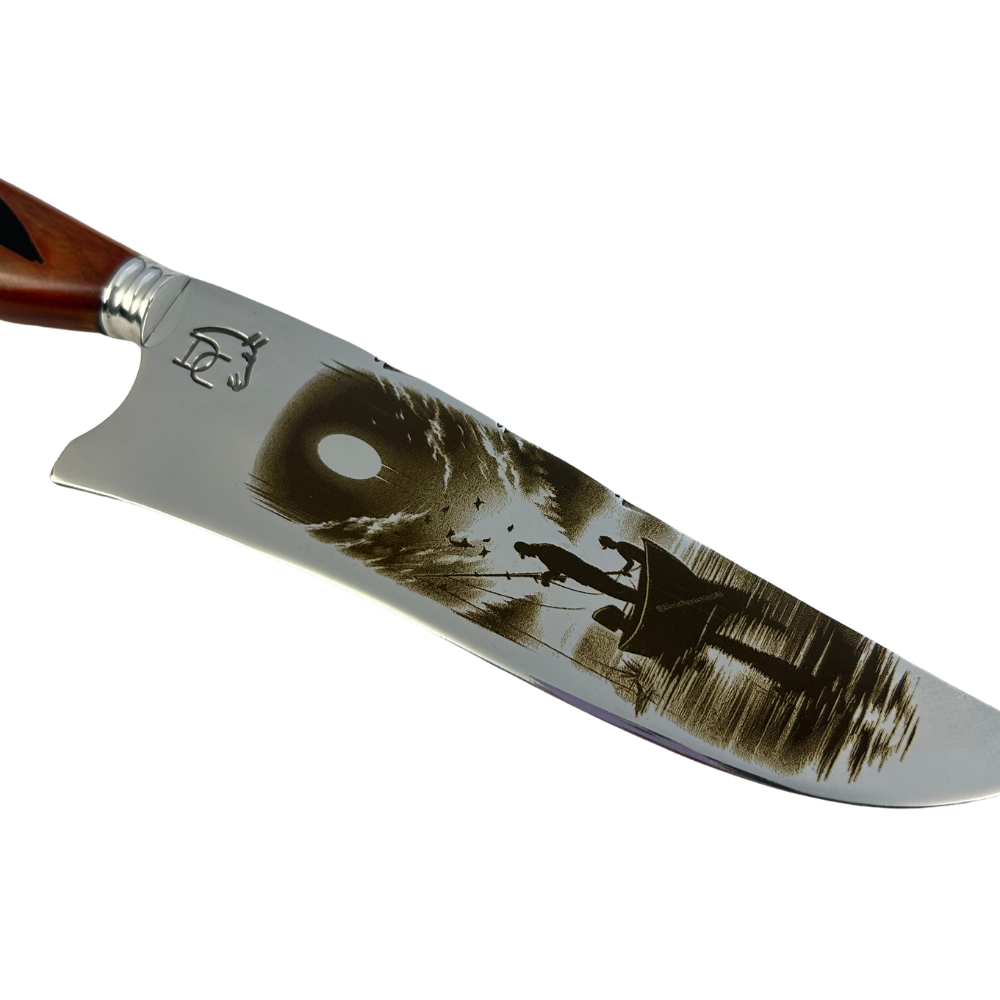 A cena de pesca é gravada com tecnologia laser de alta precisão, retratando um pescador em ação sob a lua cheia, cercado por árvores e pássaros. A arte captura a essência da pesca e a conexão com a natureza. A gravação é permanente e não desbota, tornando esta faca uma verdadeira obra de arte.