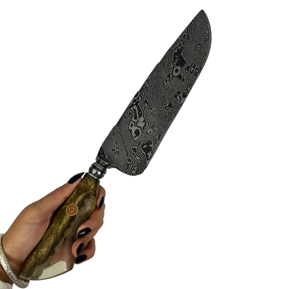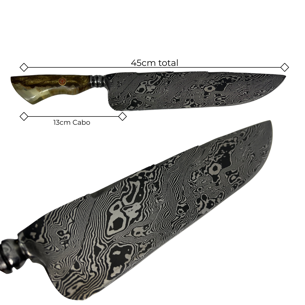Faca artesanal exclusiva forjada em aço damasco com padrão único e aleatório, cabo em resina epóxi com madeira que brilha no escuro e lâmina de 12 polegadas. Design extraordinário que combina tradição artesanal com materiais inovadores. Esta é uma peça única e irrepetível!