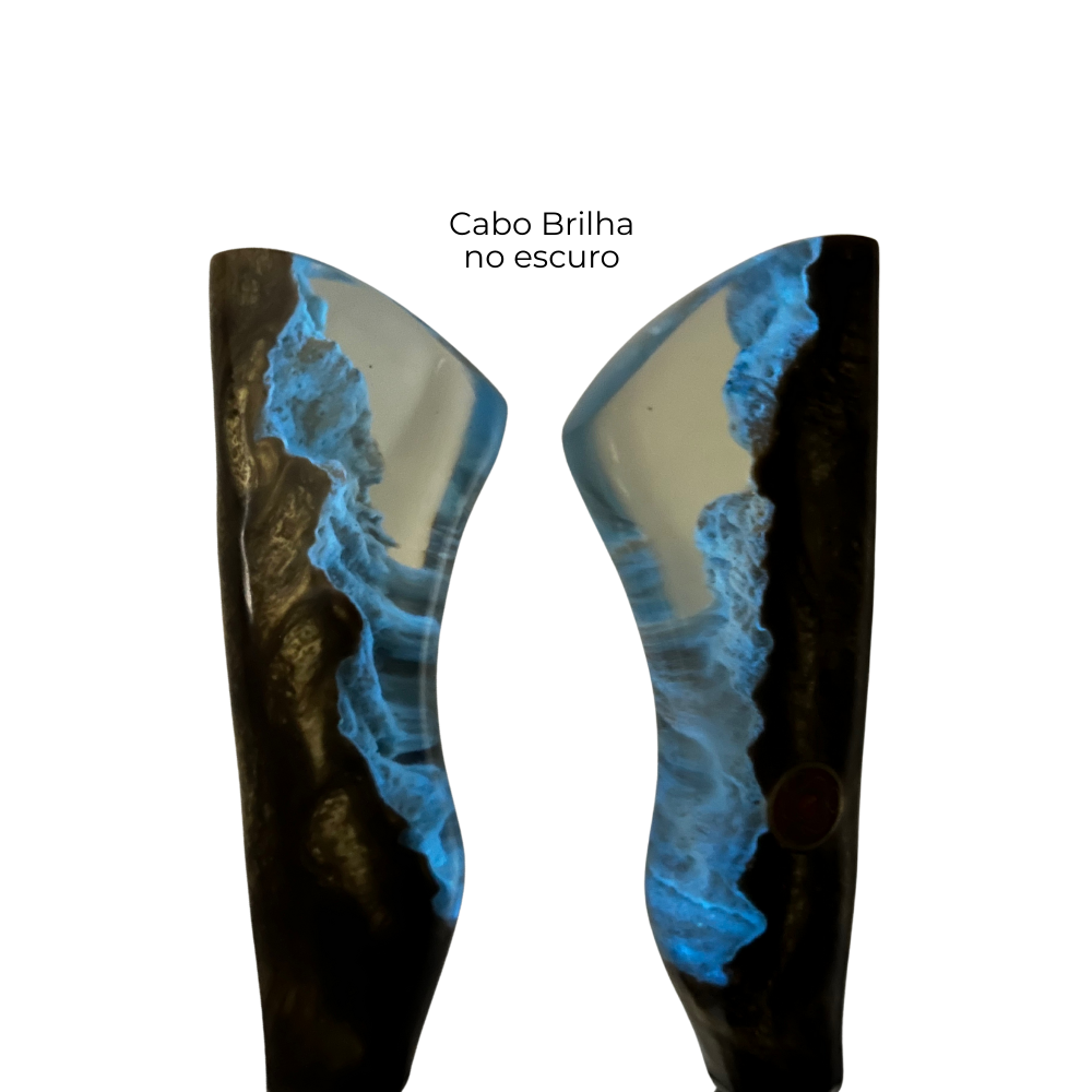 O cabo é confeccionado artesanalmente em resina epóxi de alta qualidade combinada com madeira natural e pigmentos fotoluminescentes que brilham no escuro. O resultado é uma peça única com padrões orgânicos exclusivos que ganham vida quando a luz se apaga. Além da beleza extraordinária, a resina oferece excelente aderência, durabilidade e resistência à umidade.