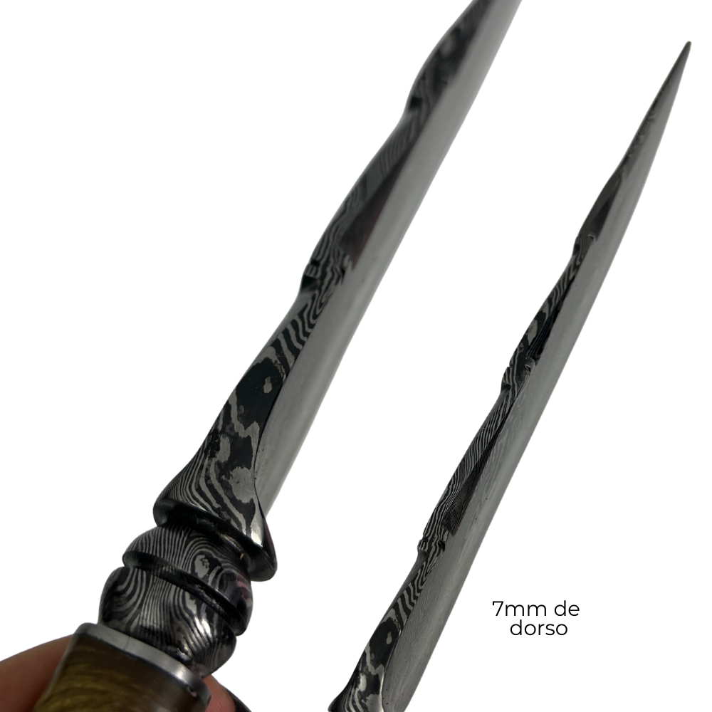 O aço damasco é forjado artesanalmente através da técnica milenar de dobramento e soldagem de múltiplas camadas de aço, criando padrões únicos e aleatórios de veios. Cada lâmina possui um desenho exclusivo e irrepetível, tornando cada faca uma verdadeira obra de arte. Além da beleza estética, o damasco oferece excelente retenção de fio e durabilidade superior.