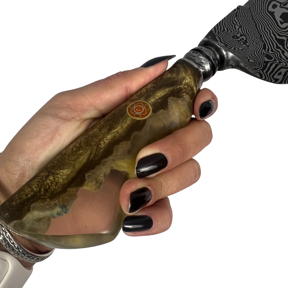 Cada faca em aço damasco possui um padrão único e irrepetível de veios, tornando esta peça uma verdadeira obra de arte funcional. O cabo em resina com madeira brilha no escuro adiciona um toque moderno e exclusivo!