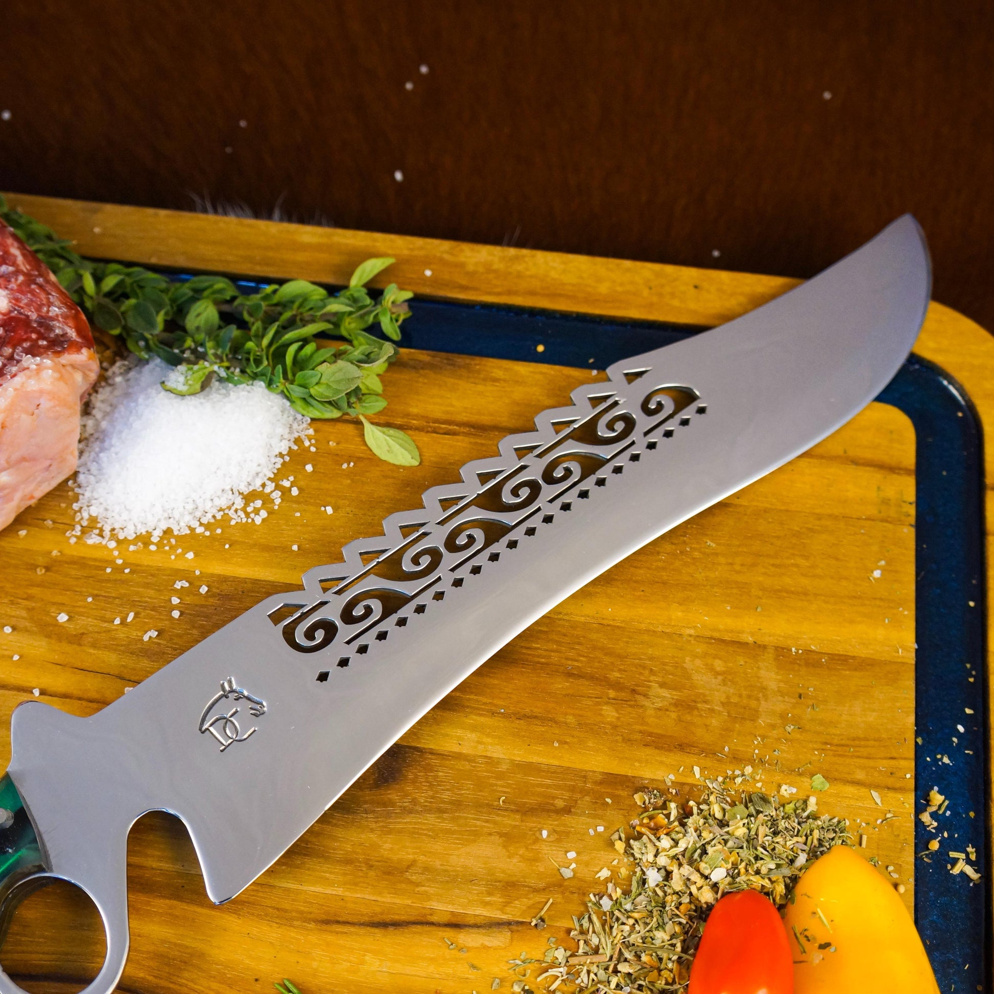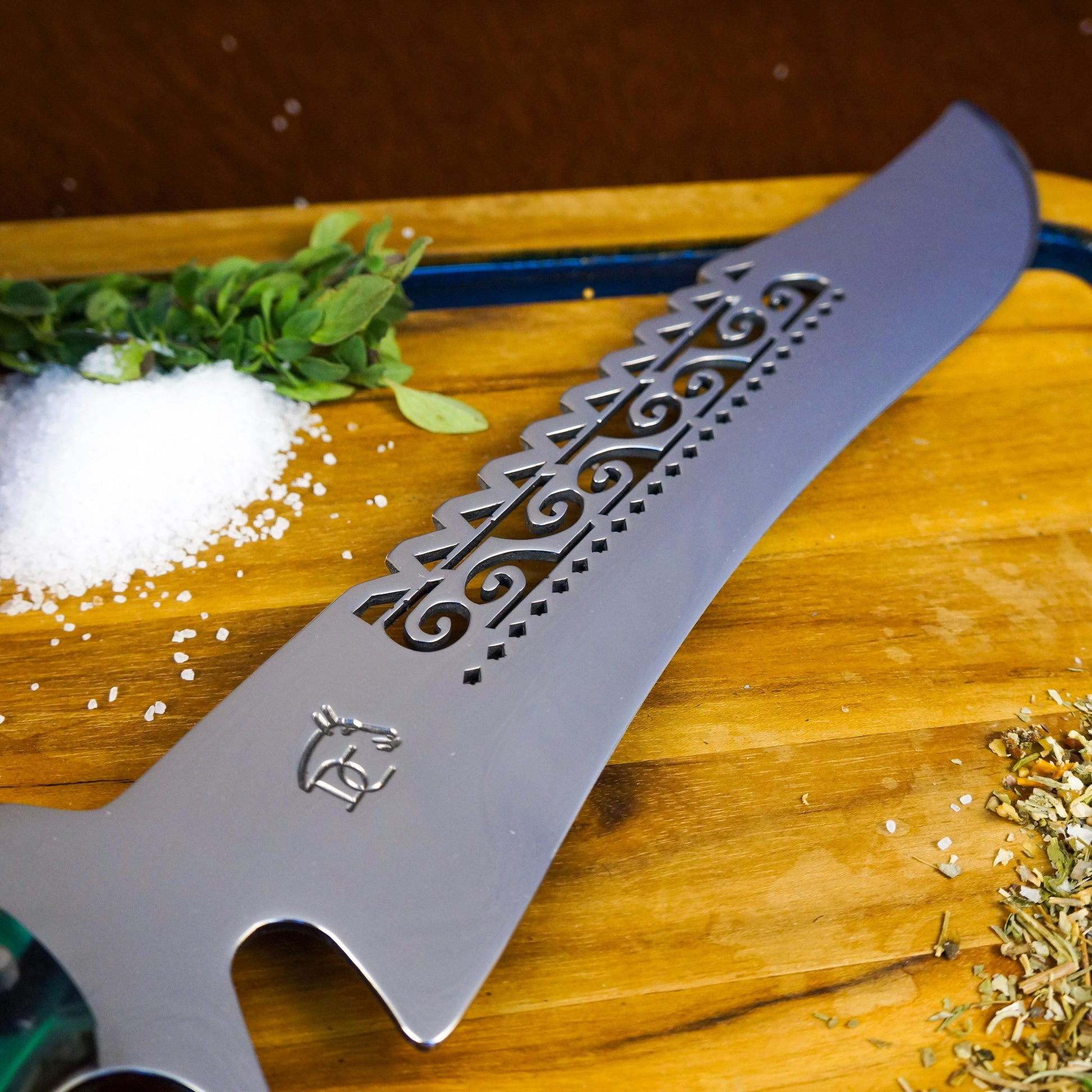 - Lâmina: 12 polegadas (30cm) em aço inoxidável de alta qualidade com vazados decorativos