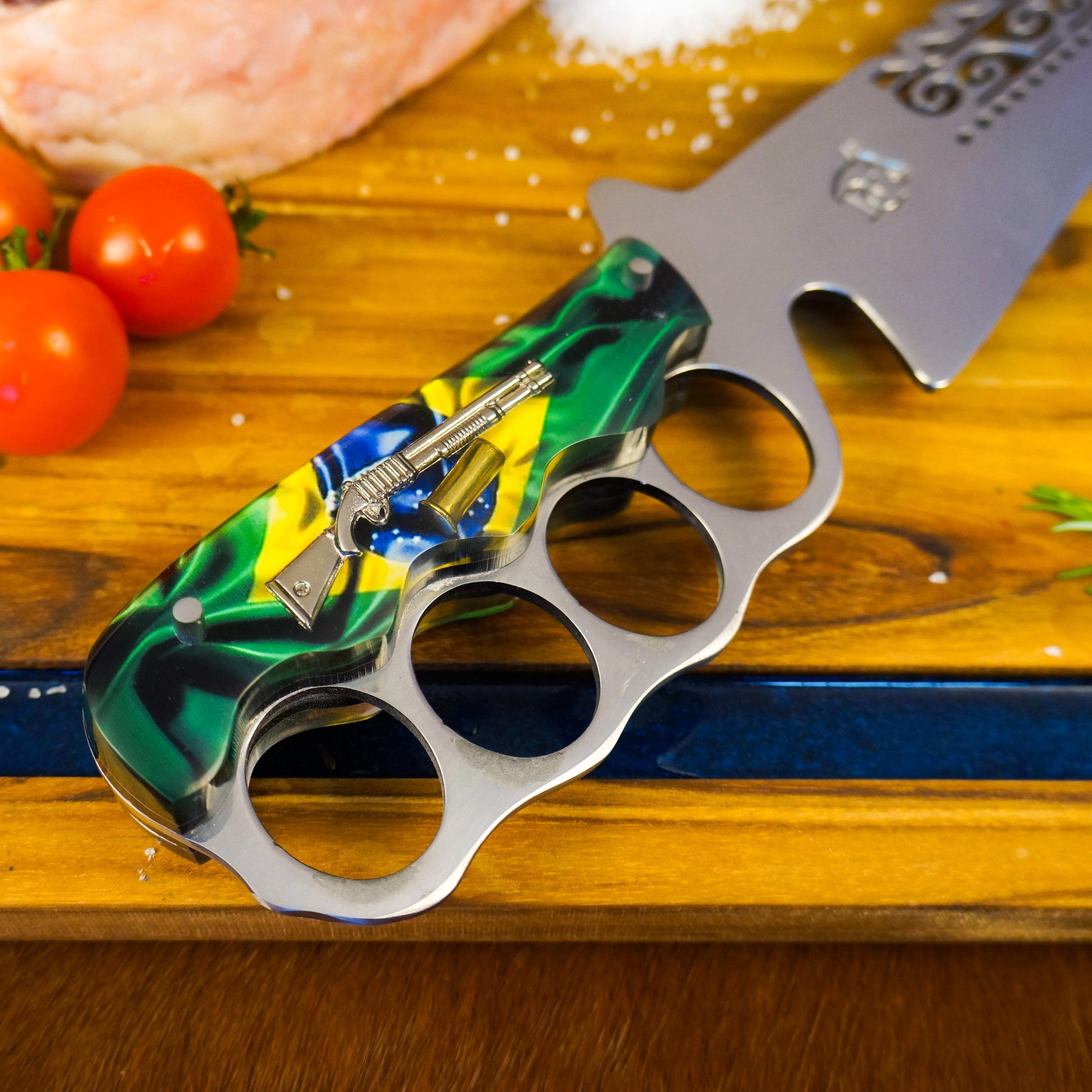 Esta não é apenas uma faca - é uma declaração de amor ao Brasil. O design tático com soco inglês combinado com as cores nacionais cria uma peça que impressiona pela originalidade e qualidade.