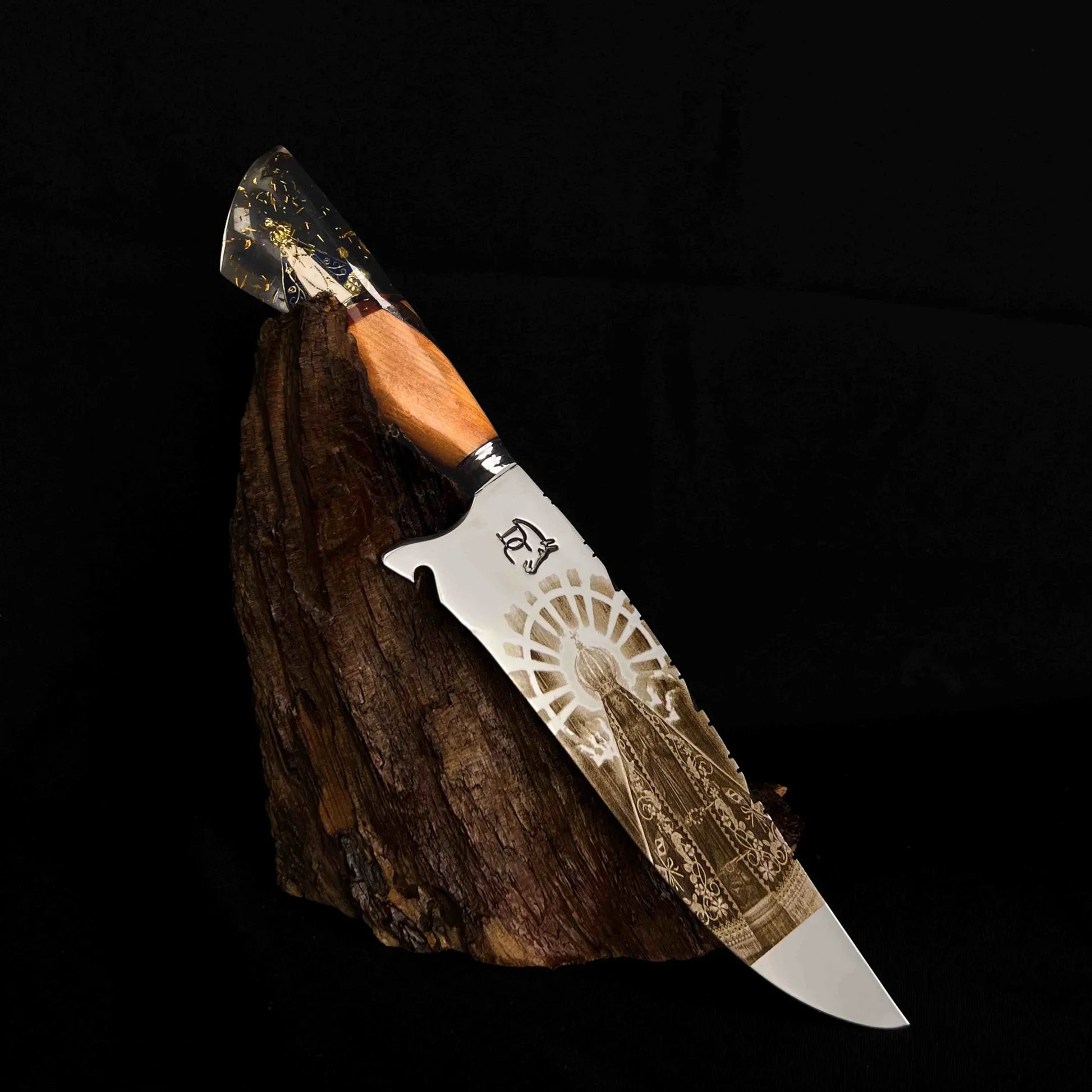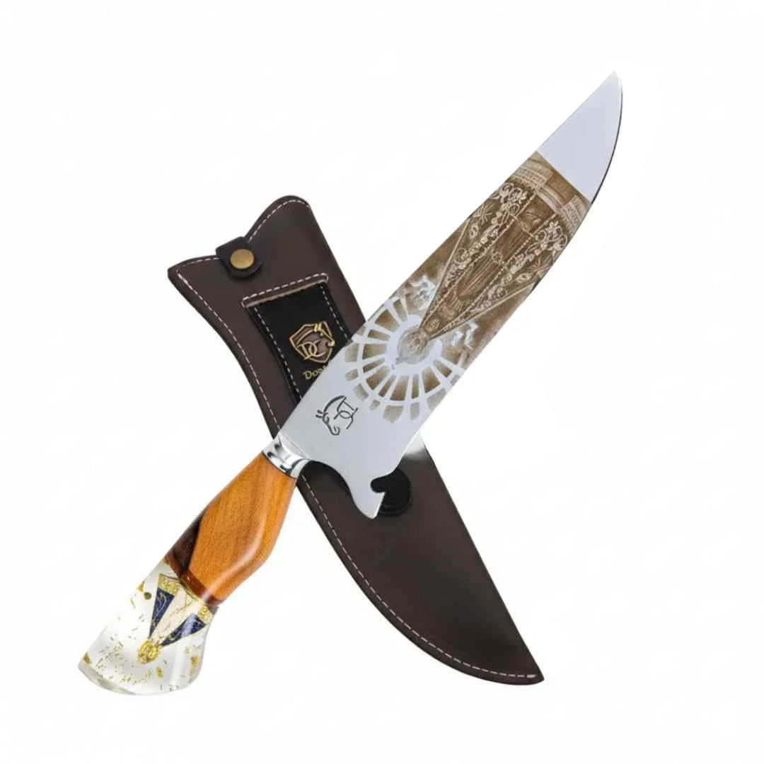 Fé e Tradição: Gravação religiosa em aço 420C, cabo madeira e resina dourada. Acompanha bainha de couro. Garantia vitalícia. Peça colecionável gaúcha.