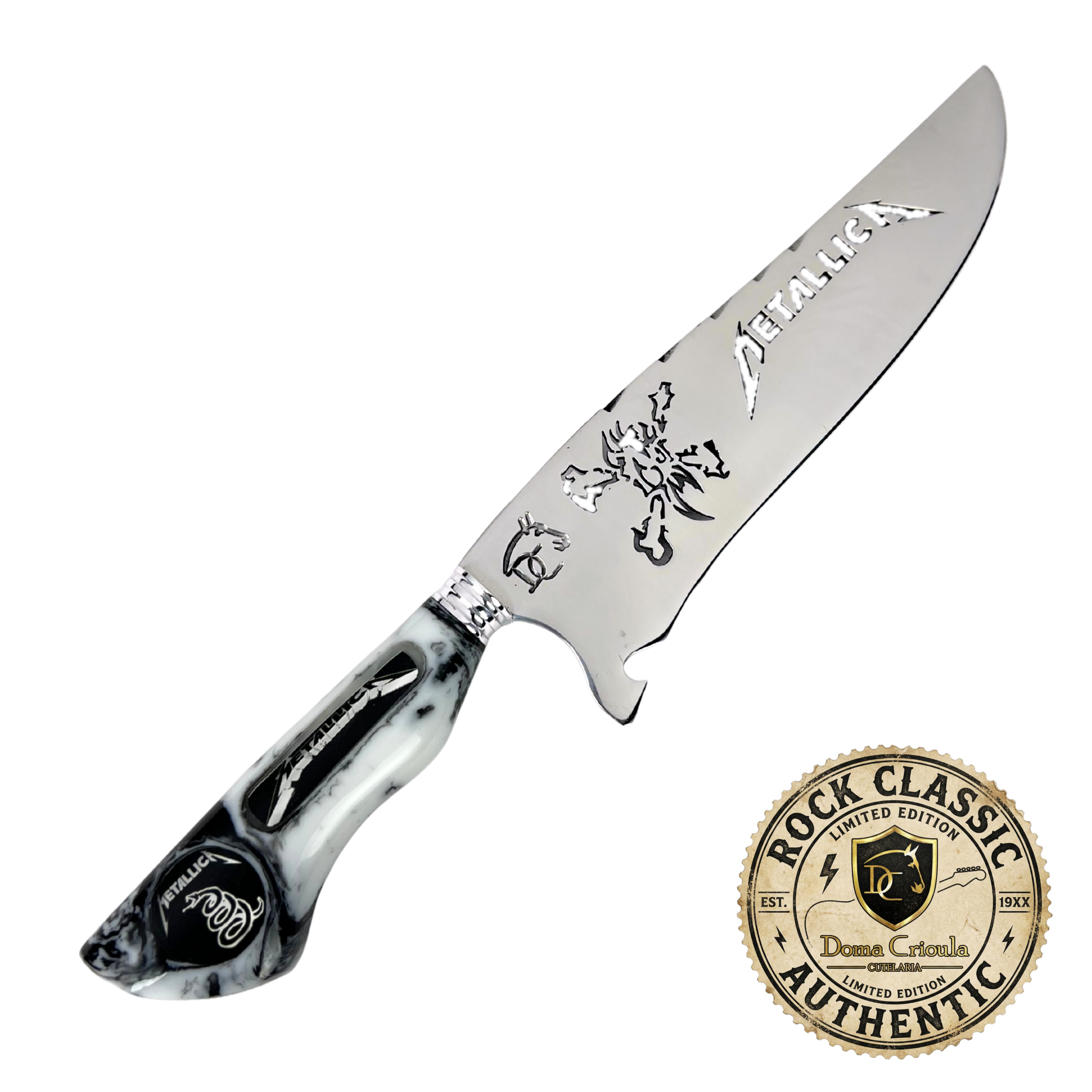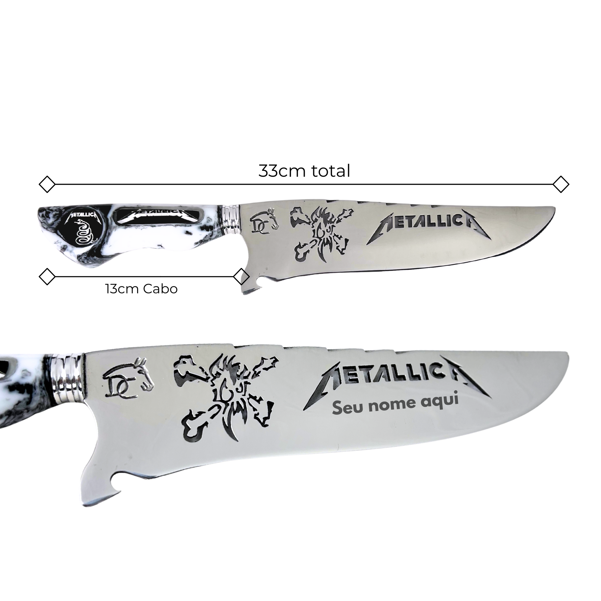 - Lâmina: Aço de alta qualidade com gravação temática Metallica