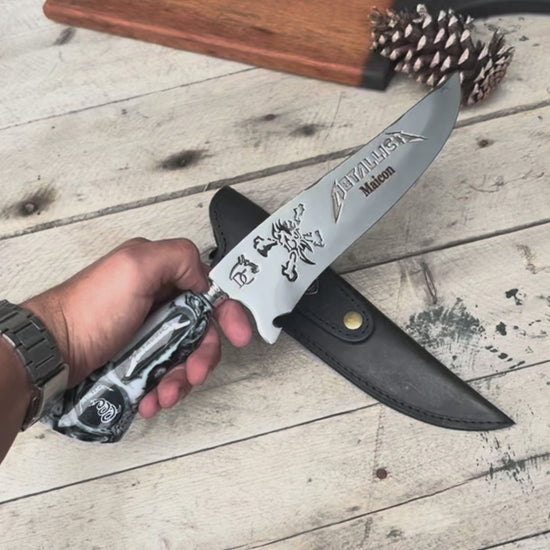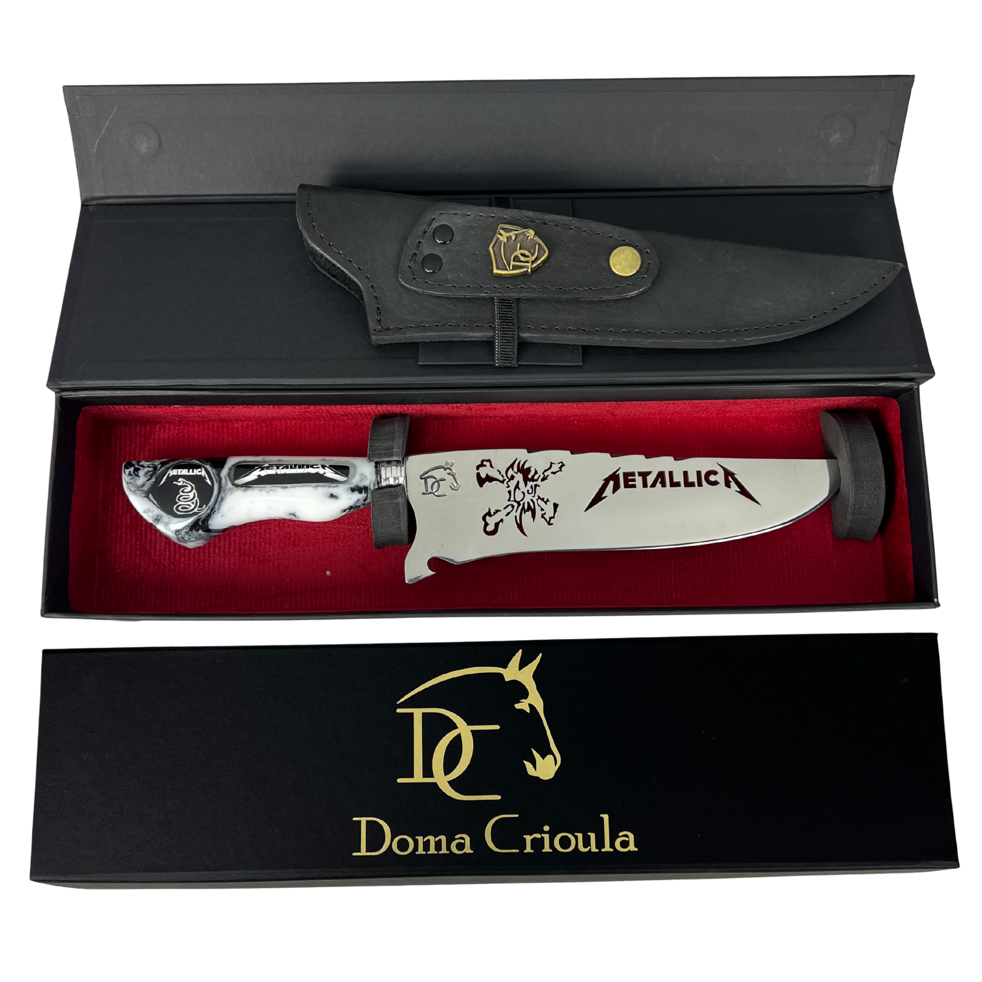 Uma verdadeira obra de arte em cutelaria artesanal para os verdadeiros fãs de heavy metal. Esta faca exclusiva da Doma Crioula combina a tradição gaúcha com a energia do rock, criando uma peça única e funcional.