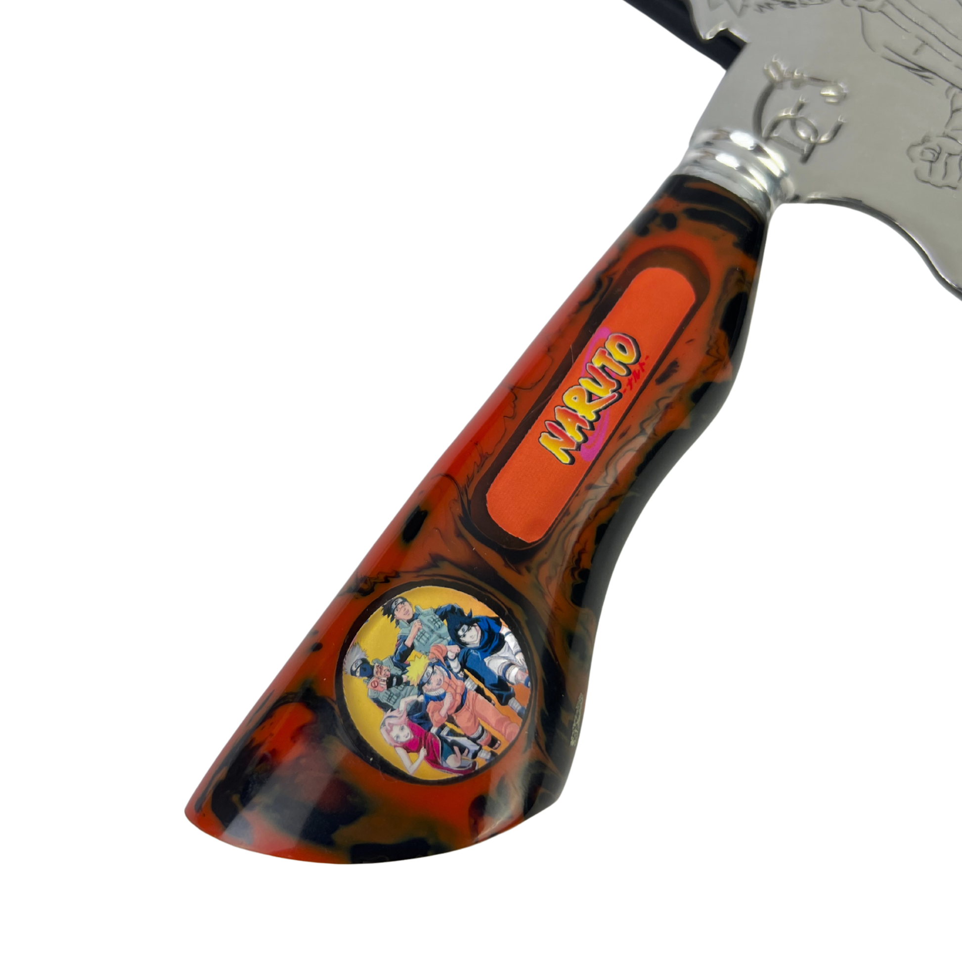 Sua lâmina de 8 polegadas com vazado temático exibe o icônico logo Naruto em alto relevo com a imagem do tigre, enquanto o cabo em resina marmorizada laranja e preta apresenta um medalhão com os personagens principais da série e o texto "NARUTO" em destaque. O padrão marmorizado único com tons laranja vibrantes remete ao chakra do protagonista, criando uma peça exclusiva para verdadeiros fãs do anime.