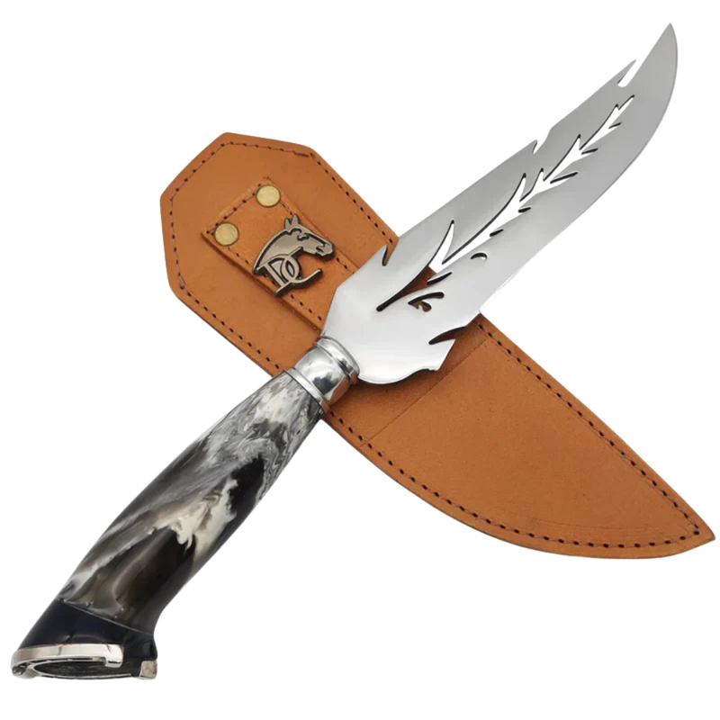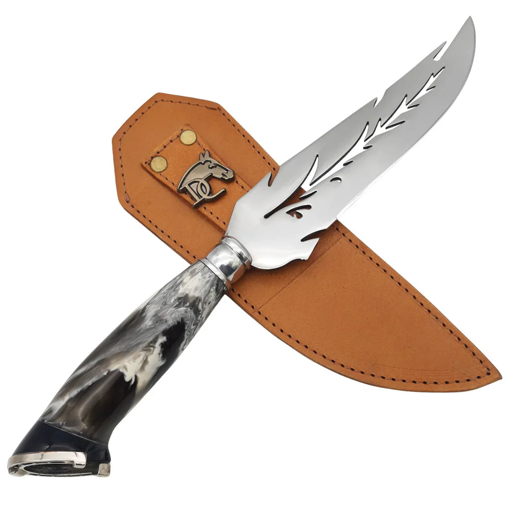 Arte e Funcionalidade: Lâmina vazada em formato de folha artística. Acompanha bainha de couro. Garantia vitalícia. Design exclusivo que impressiona.