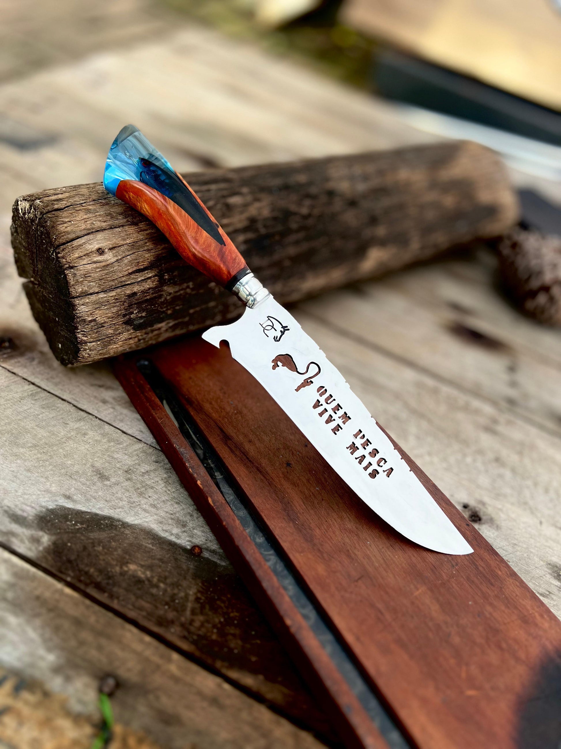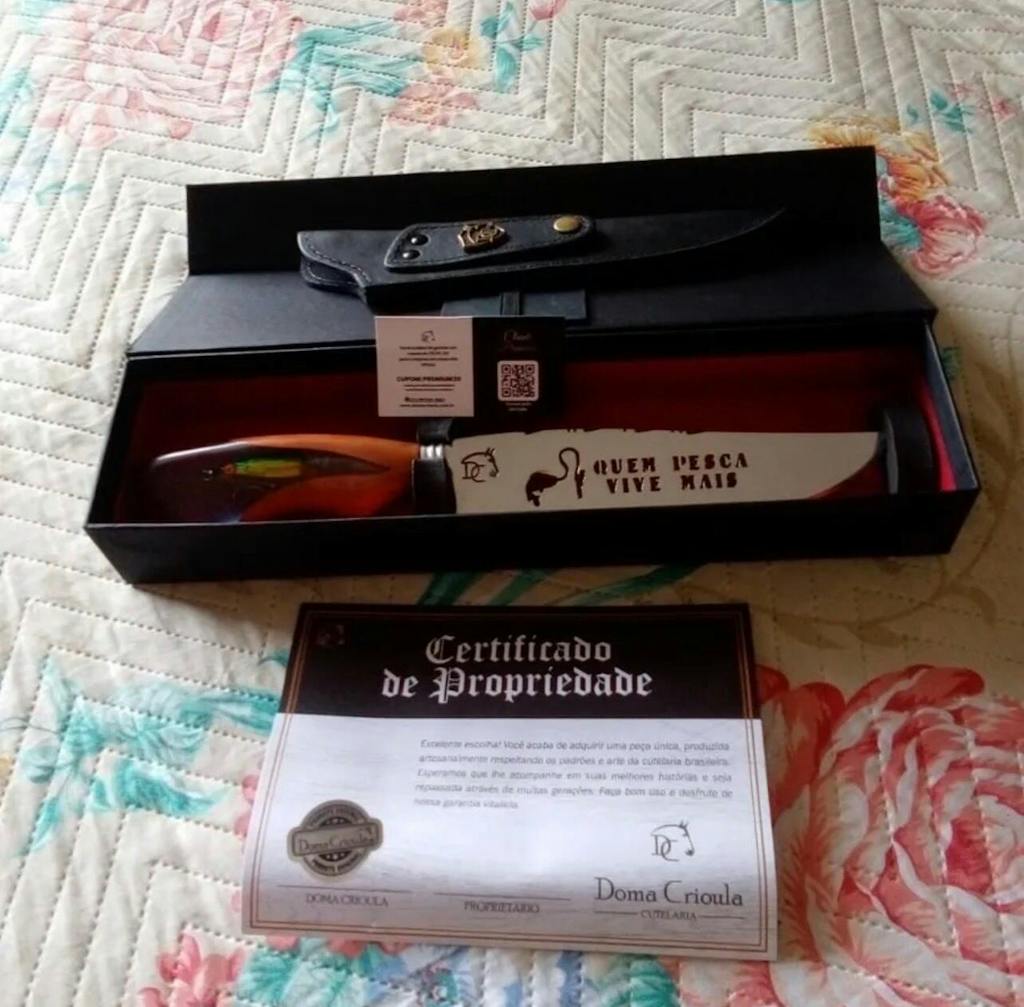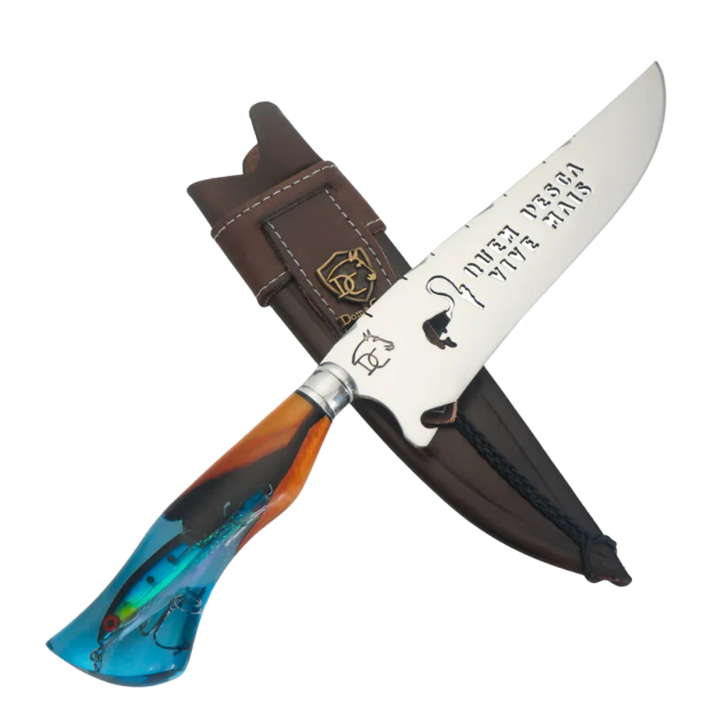 Paixão e Arte: Tema "Quem Pesca Vive Mais" em resina, lâmina vazada artística. Acompanha bainha de couro. Garantia vitalícia. Peça exclusiva para pescadores.