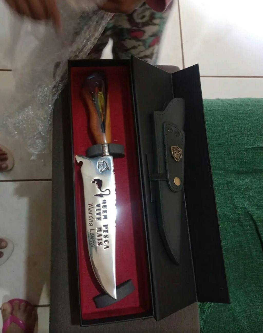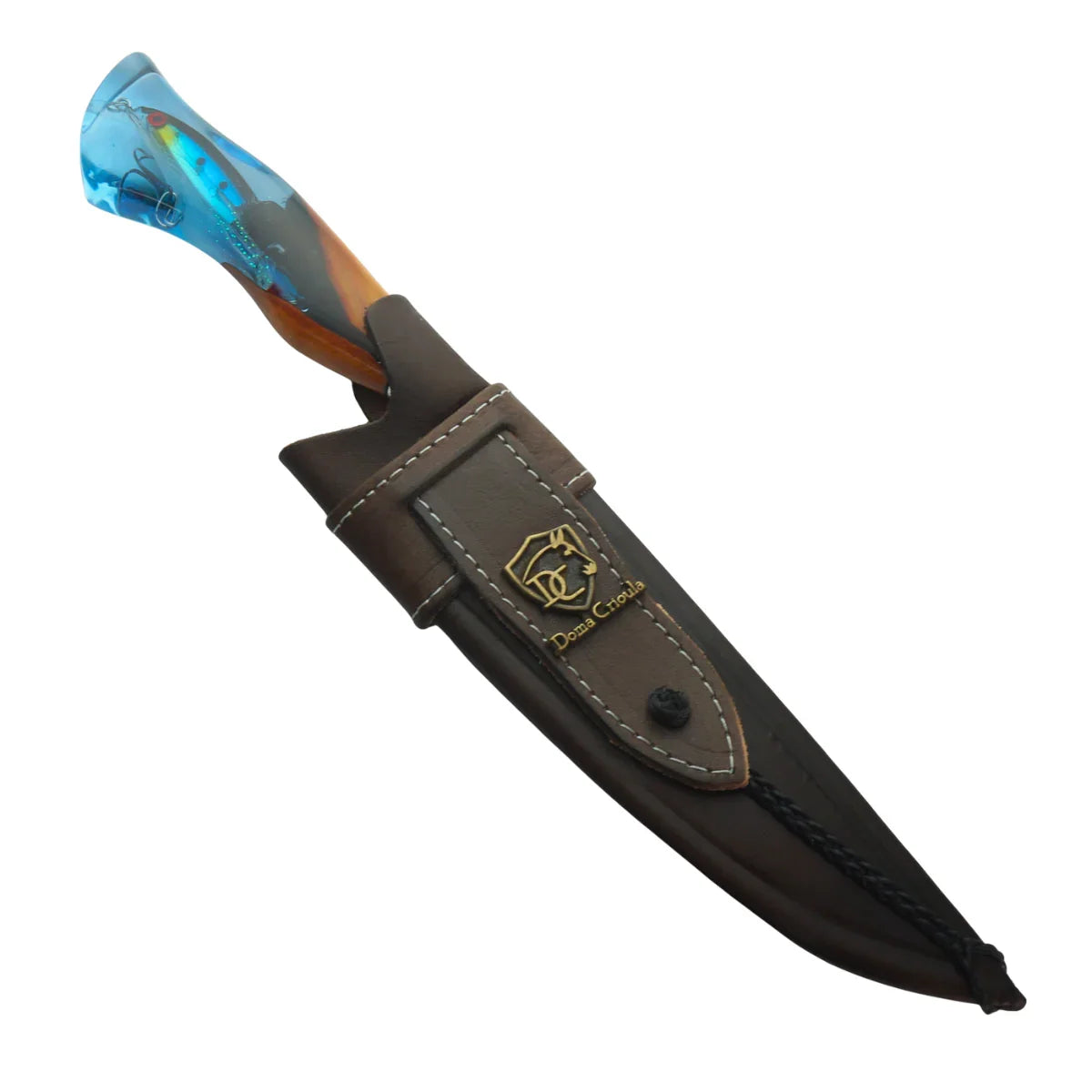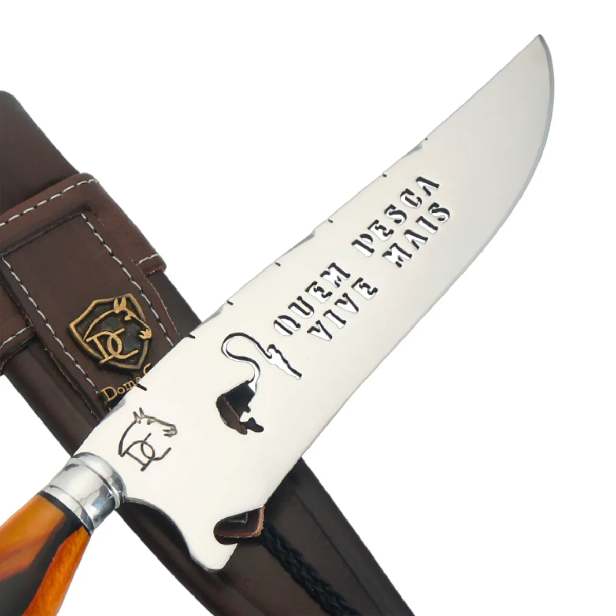Paixão e Arte: Tema "Quem Pesca Vive Mais" em resina, lâmina vazada artística. Acompanha bainha de couro. Garantia vitalícia. Peça exclusiva para pescadores.