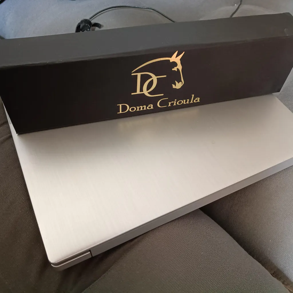 - Embalagem: Estojo premium preto com forro vermelho e logo Doma Crioula