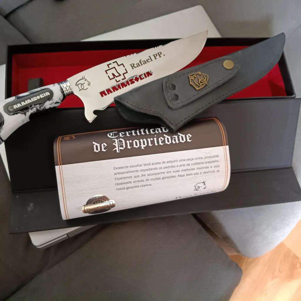 Cada faca é produzida artesanalmente com atenção aos mínimos detalhes, garantindo qualidade superior e exclusividade. O cabo em resina com padrão marmoreado preto e branco remete à estética industrial do Rammstein, enquanto a cruz estilizada e a gravação na lâmina completam o tributo à banda que revolucionou o rock alemão.