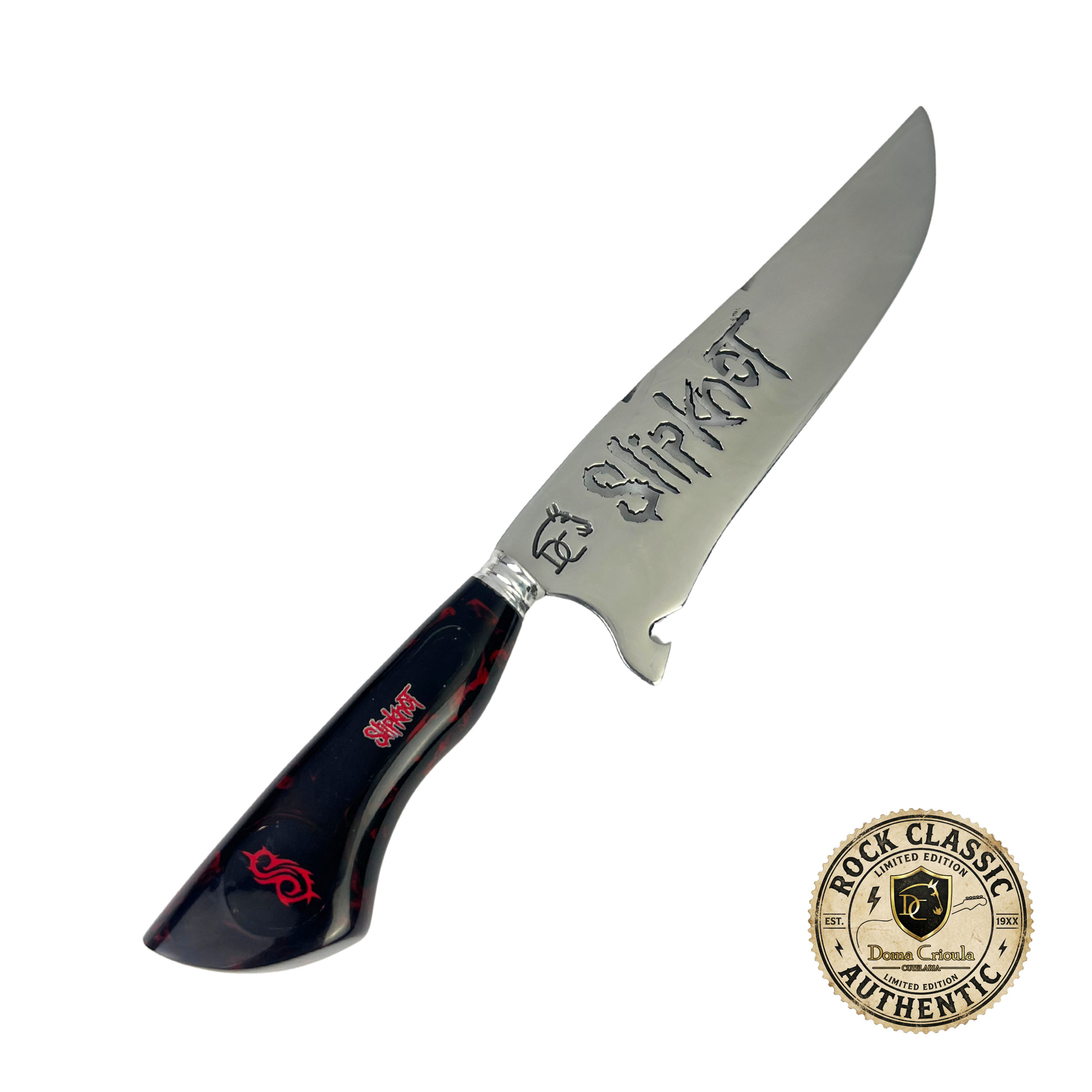 Sua lâmina de 8 polegadas com vazado temático exibe o icônico logo Slipknot em alto relevo, enquanto o cabo em resina preta com detalhes vermelhos sangue apresenta o nome da banda e o símbolo tribal característico. O visual dark e agressivo reflete perfeitamente a estética brutal da banda.