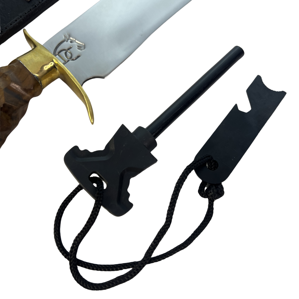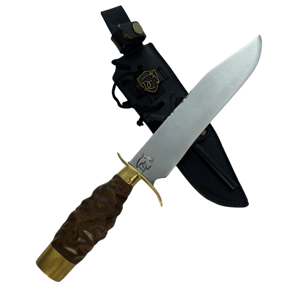 Uma verdadeira obra de arte da cutelaria tática! Esta faca exclusiva combina a resistência do aço inoxidável 420C com a elegância de um cabo em madeira nobre esculpida à mão e detalhes em latão dourado, criando uma peça tática de alto desempenho com visual sofisticado e único.
